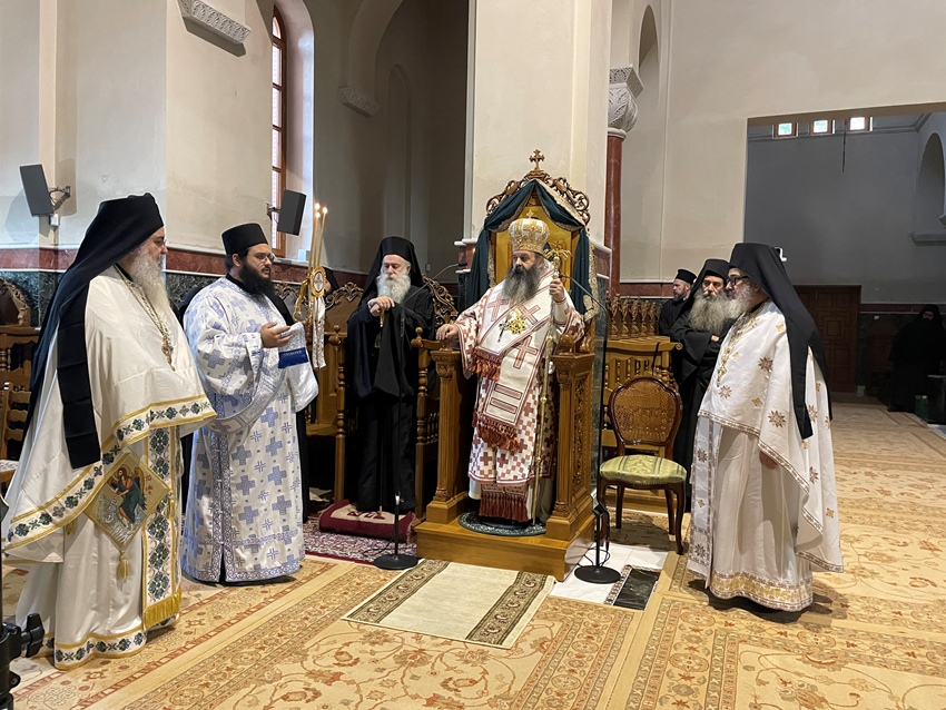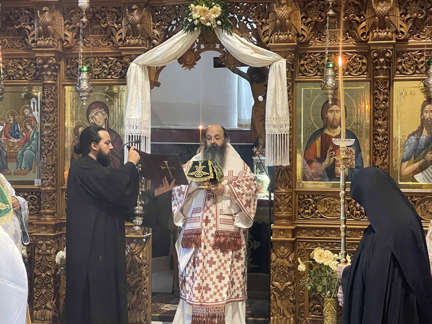 Αρχικά τελέσθηκε στο Καθολικό του Ι. Ησυχαστηρίου Αρχιερατική Θ. Λειτουργία από τον Πρωτοσύγκελο της Ι. Μητροπόλεως, Θεοφιλέστατο Επίσκοπο Κεγχρεών κ. Αγάπιο, συμπροσευχομένου του Σεβ. Μητροπολίτου Κορίνθου κ. Παύλου.