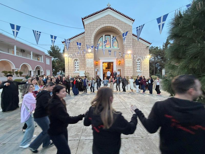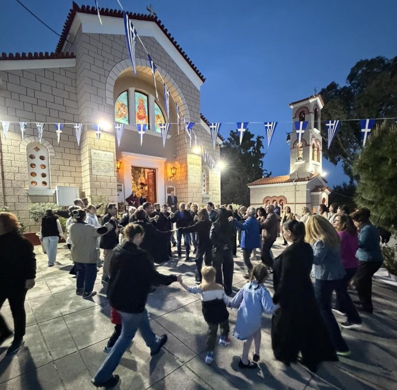 Μετά το τέλος του Εσπερινού και αφού οι χριστιανοί έλαβαν παραδοσιακές ευλογίες από τα χέρια του Σεβασμιωτάτου, όλοι μετέβησαν στην αυλή του Ιερού Ναού, όπου στήθηκε το Χοροστάσι Αγάπης, κατά το οποίο εκτελέσθηκε πλούσιο παραδοσιακό μουσικό και χορευτικό πρόγραμμα, το οποίο διαμόρφωσαν το μουσικό συγκρότημα της Σχολής Παραδοσιακής Μουσικής «Γέφυρες» και μέλη των Πολιτιστικών Συλλόγων «Τ’ Αλωνάκι», «Παναγία Φανερωμένη» και «Η Παντάνασσα». Στο Χοροστάσι συμμετείχαν και όλοι οι προσελθόντες στον Εσπερινό, οι οποίοι πιασμένοι χέρι-χέρι πανηγύρισαν και με αυτό τον τρόπο, αγαπημένοι και μονιασμένοι, την Ανάσταση του Χριστού, σ’ ένα χορό που κράτησε μέχρι αργά το βράδυ και ευχαρίστησε τους πάντες.