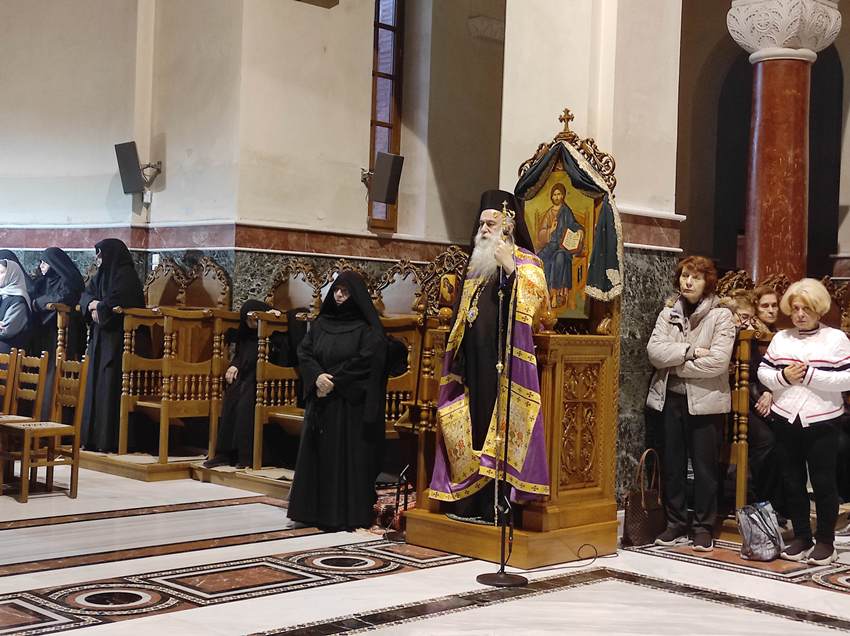 Το απόγευμα της ίδιας ημέρας ο Σεβασμιώτατος συνέχισε με τον ίδιο ζήλο τις επισκέψεις του σε Ι. Ναούς και Ι. Μονές της Μητροπολιτικής Περιφερείας μας. Στο Ι. Ησυχαστήριο «Ο ΤΙΜΙΟΣ ΣΤΑΥΡΟΣ» Μαψού τέλεσε την Ι. Ακολουθία του Εσπερινού, μετά το πέρας της οποίας ο σεπτός Ποιμενάρχης μας είχε την ευκαιρία να συνομιλήσει με την Ηγουμένη Αδελφή Ιλαρία και την πολυπληθή αδελφότητα, καθώς και να τις δώσει τις ευχές και την ευλογία του.