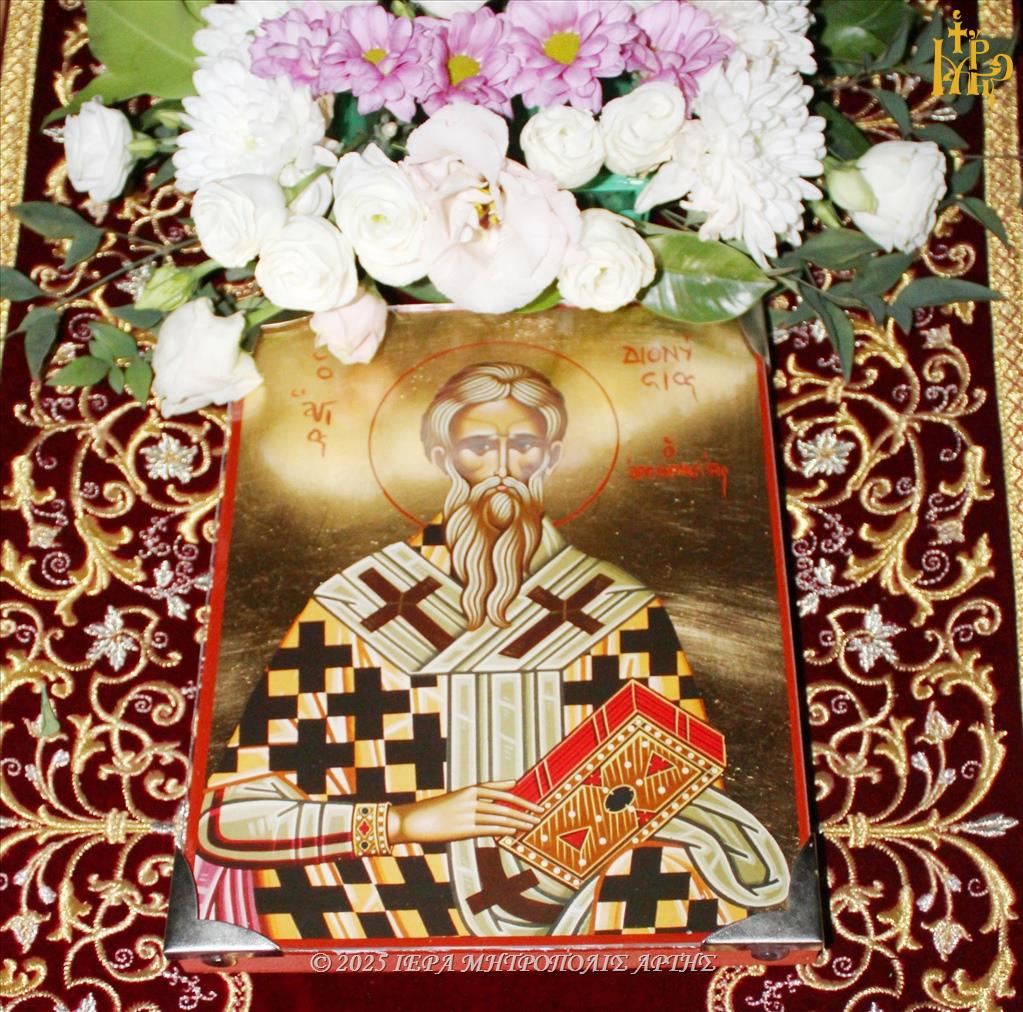 Την Παρασκευή 3 Οκτωβρίου 2025 το πρωί, στον Ιερό Ναό Αγίου Ιωάννου Θεολόγου στην πόλη της Άρτας, ετελέσθη η Θεία Λειτουργία προς τιμήν του Αγίου Διονυσίου του Αρεοπαγίτου, προστάτου των Νομικών, ιερουργούντος του Σεβασμιωτάτου Μητροπολίτου Άρτης κ. Καλλινίκου, ο οποίος στο Κήρυγμά του, ετόνισε, ότι «το δίκαιο ζει, στην αγκαλιά Αλήθειας», υπενθυμίζοντας, πως η δικαιοσύνη πηγάζει από την θεϊκή καθοδήγηση και την εσωτερική αλήθεια.