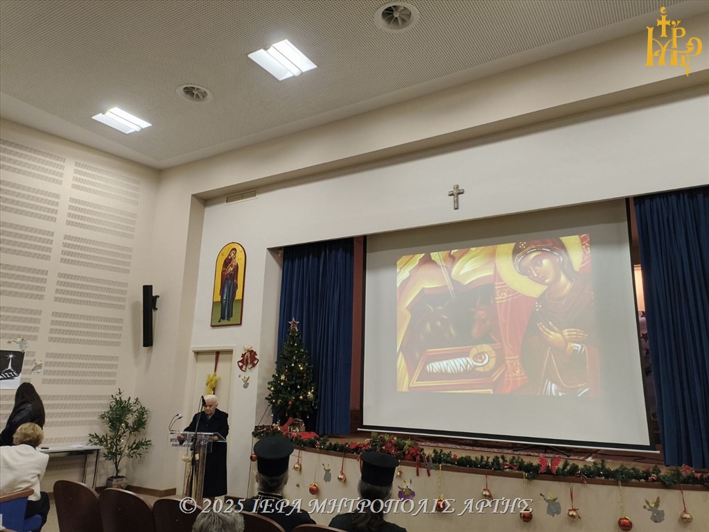 Στην εκδήλωση παρευρέθη και ο Σεβασμιώτατος Μητροπολίτης Άρτης κ. Καλλίνικος, ο οποίος συνεχάρη θερμά τους υπευθύνους και τα μέλη των Κύκλων Μελέτης Αγίας Γραφής για την προσπάθεια και τον ζήλο τους, τονίζοντας τη σημασία της μελέτης του Λόγου του Θεού στη ζωή των πιστών. Παράλληλα, ευχήθηκε σε όλους ευλογημένα και φωτεινά Χριστούγεννα, γεμάτα πίστη, αγάπη και ελπίδα.