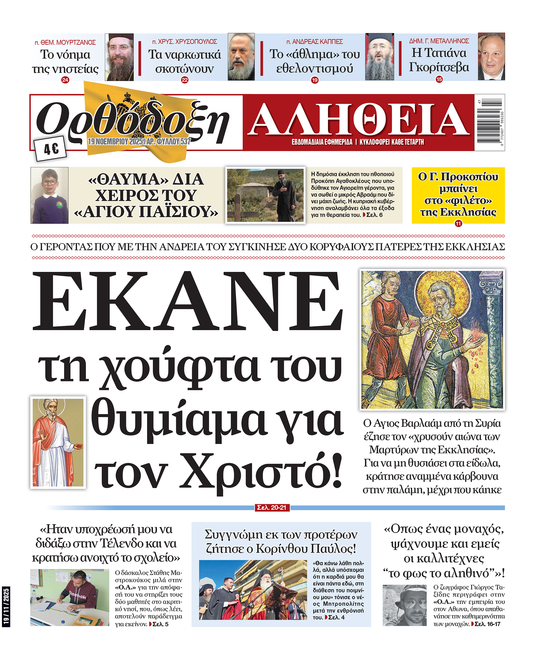 Η εφημερίδα αφιερώνει το βασικό της θέμα στον Γέροντα που με την ανδρεία του συγκίνησε δύο κορυφαίους Πατέρες της Εκκλησίας. Έκανε τη χούφτα του θυμίαμα για τον Χριστό. Ο Αγιος Βαρλαάμ από τη Συρία έζησε τον «χρυσούν αιώνα των Μαρτύρων της Εκκλησίας». Για να μη θυσιάσει στα είδωλα, κράτησε αναμμένα κάρβουνα στην παλάμη, μέχρι που κάηκε.