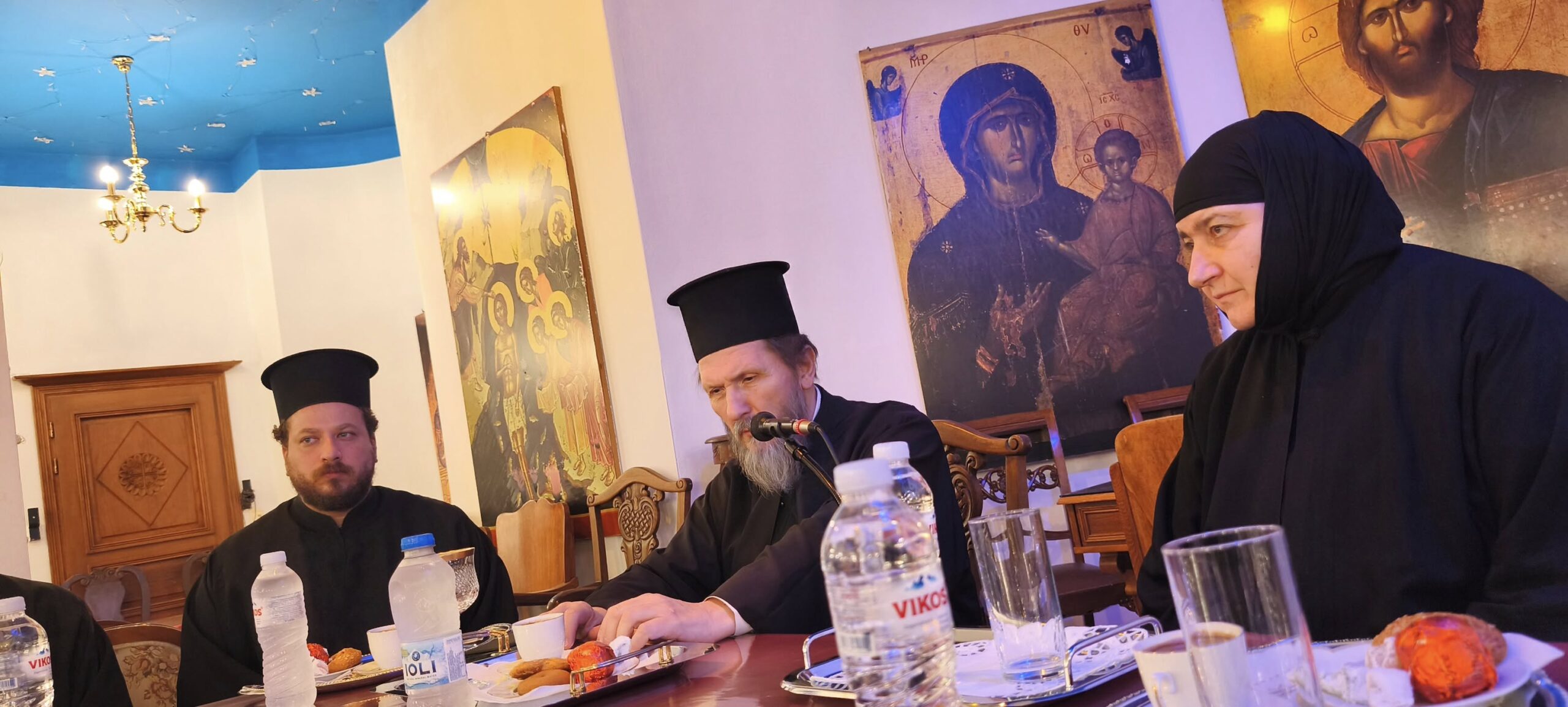 Μετά τό πέρας τοῦ Ἑσπερινοῦ ἀκολούθησε κέρασμα στό Ἀρχονταρίκι. Ἐν συνεχείᾳ, ὁ Σεβασμιώτατος κ. Ἀντώνιος εὐχαρίστησε τόν Μητροπολίτη Μεγάρων καί Σαλαμῖνος κ. Κωνσταντῖνο γιά τήν ἄδεια καί εὐλογία νά ἐπισκεφθοῦν τό Μοναστήρι τῆς Ἐπαρχίας του, καθώς καί τήν Καθηγουμένη καί τίς ἀδελφές γιά τήν ὑποδοχή καί φιλοξενία. Ἐν συνεχείᾳ, παρεκάλεσε τήν Καθηγουμένη νά ἀναφερθεῖ ἐν συντομίᾳ στό ἱστορικό τῆς Μονῆς.