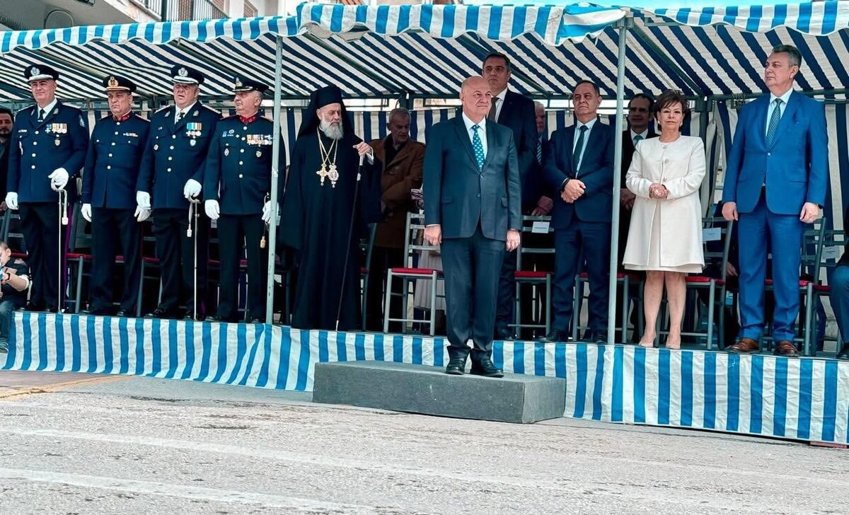 Στη συνέχεια και ώρα 12:00 μ., ο Σεβασμιώτατος παρέστη στην καθιερωμένη μαθητική και στρατιωτική παρέλαση της πόλεώς μας, συμμετέχοντας μαζί με τον λαό στην απόδοση τιμής προς την ιστορική αυτή ημέρα της πίστεως και της πατρίδος.