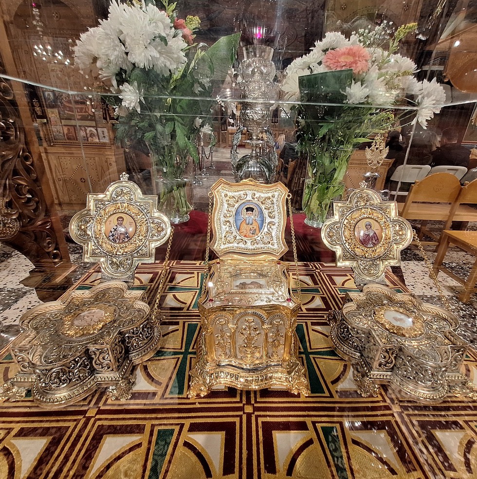 Ἀφοῦ κοινώνησε ὁ πιστὸς λαὸς τοῦ Θεοῦ, λιτανεύθηκαν ἐντὸς τοῦ Ἱ.Ναοῦ λείψανα τοῦ Ἁγίου Δημητρίου Γκαγκαστάθη, τῆς Ὁσίας Γαβριηλίας καὶ τοῦ Ἁγίου Ἐλευθερίου, τὰ ὁποῖα φυλάσσονται στὸ ἱερὸ Σκευοφυλάκιο τοῦ Ναοῦ. Τὰ λείψανα ἐναπετέθησαν ἐντὸς ὑαλίνης προθήκης πρὸς προσκύνηση τῶν πιστῶν καὶ θὰ παραμείνουν ἐκεῖ ἕως τὴν Κυριακὴ 8 Φεβρουαρίου 2026.