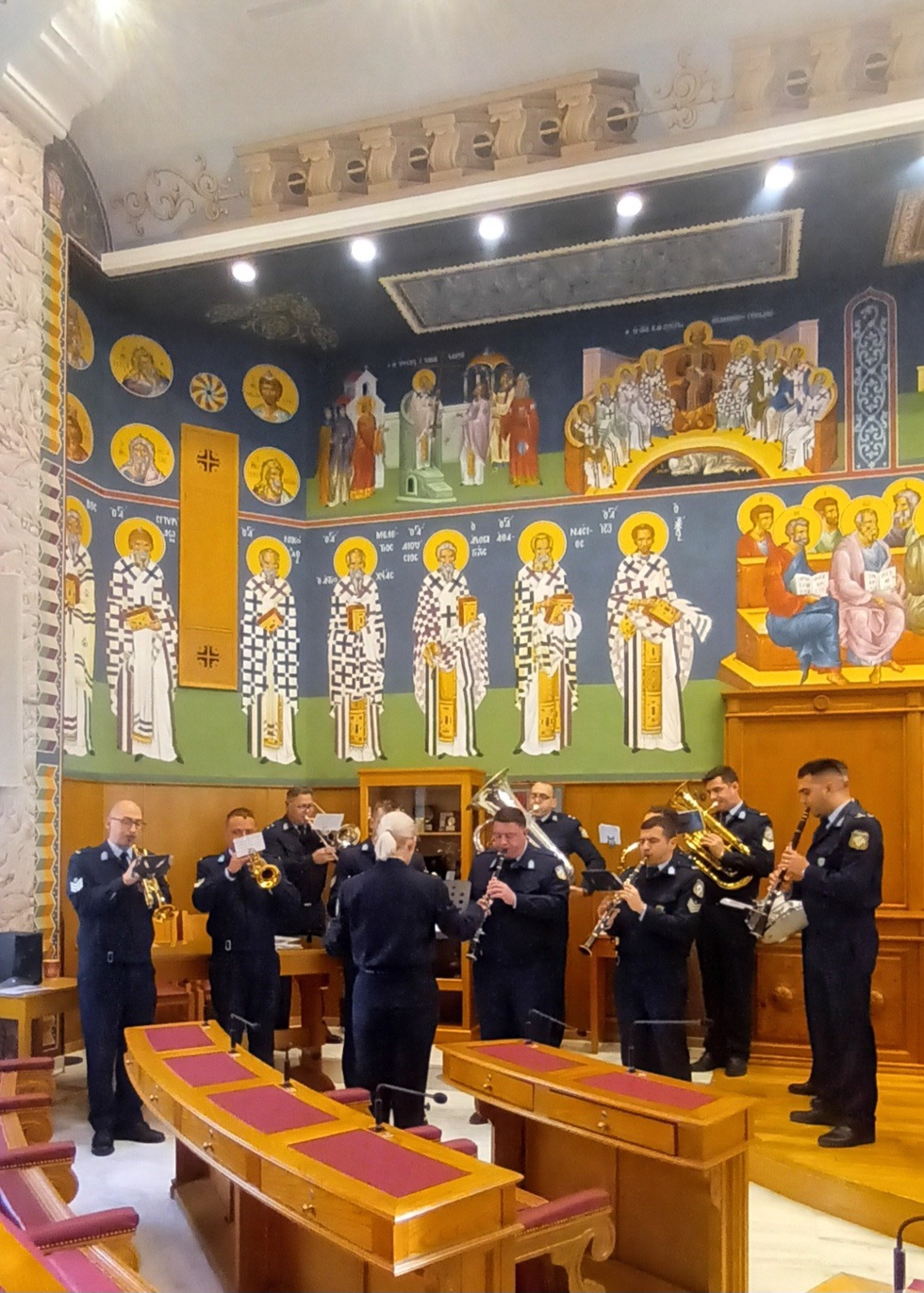 Σήμερα, Παρασκευή 19 Δεκεμβρίου, παρόντος του Θεοφιλεστάτου Αρχιγραμματέως της Ιεράς Συνόδου, έψαλε τα κάλαντα η Μουσική Μπάντα του Πυροσβεστικού Σώματος, υπό την διεύθυνση του Αρχιμουσικού–Υποπυραγού κ. Δημήτριου Κουνδουράκη.