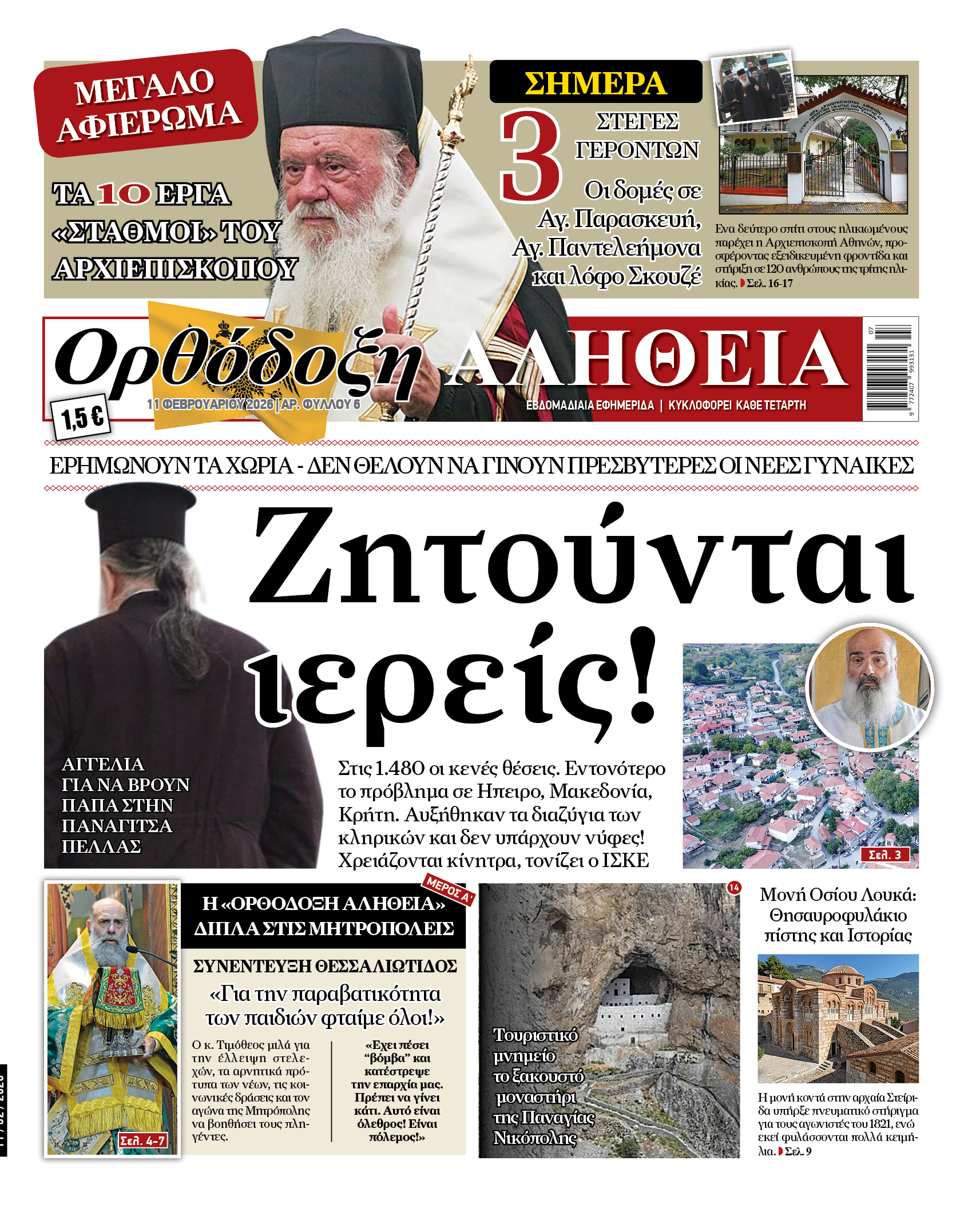 Στη νέα της κυκλοφορία, η εφημερίδα «Ορθόδοξη Αλήθεια» αναδεικνύει αυτή την Τετάρτη ένα μείζον κοινωνικό και εκκλησιαστικό πρόβλημα που απειλεί την καρδιά της ελληνικής υπαίθρου: την έλλειψη ιερέων και την εγκατάλειψη των χωριών.