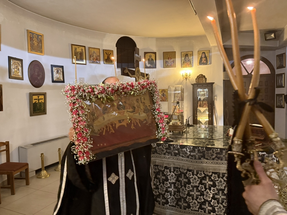 Καθώς πλήθη λαού προσκυνούσαν την Ιερά Εικόνα του Μυστικού Δείπνου που απεικονίζει την παράδοση του φρικτού Μυστηρίου της Θείας Ευχαριστίας, ο Σεβασμιώτατος αναφέρθηκε στην ιερότητα του Μυστηρίου αυτού, ως του πολυτιμότερου στην Εκκλησία μας, και συνακόλουθα στην πολλή προσοχή και σεβασμό με τα οποία πρέπει να προσεγγίζουμε το Ιερό Μυστήριο. Παρακάλεσε δε να τηρούμε την προτροπή της Εκκλησίας, να προσερχόμαστε όλοι “μετά φόβου Θεού, πίστεως και αγάπης”.