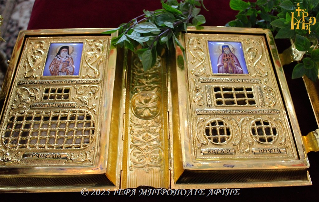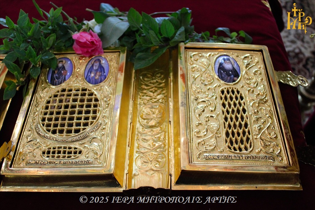 Μέσα σε κλίμα κατάνυξης, πραγματοποιήθηκε την Τετάρτη 19 Νοεμβρίου 2025, το απόγευμα, μία ξεχωριστή πνευματική εκδήλωση για την τοπική Εκκλησία της Άρτης. Στον ενοριακό Ιερὸ Ναὸ του Αγίου Μαξίμου του Γραικού, ο Σεβασμιώτατος Μητροπολίτης Άρτης κ. Καλλίνικος υπεδέχθη τα Ιερά Λείψανα πέντε μεγάλων και θαυματουργών Αγίων της Εκκλησίας μας: του Αγίου Λουκά του Ιατρού, του Αγίου Νεκταρίου, του Αγίου Αθανασίου του Χαμακιώτου, του Αγίου Εφραίμ του Κατουνακιώτου και του Αγίου Αρσενίου του Καππαδόκου. Τα Τίμια Λείψανα εκομίσθησαν προς προσκύνηση στην Άρτα από τον Σεβασμιώτατο Μητροπολίτη Ἀργολίδος κ. Νεκτάριο, ο οποίος ανταποκρίθηκε με προθυμία στην πρόσκληση του Ποιμενάρχου μας κ. Καλλινίκου.