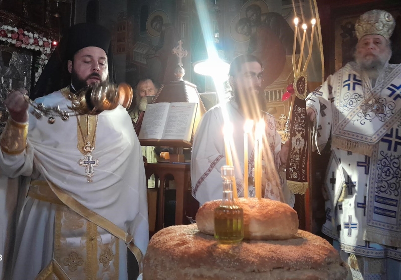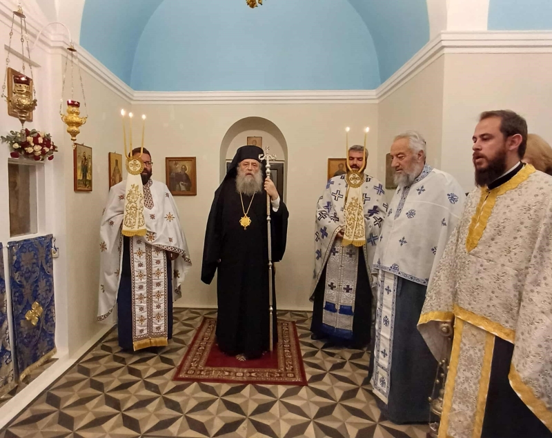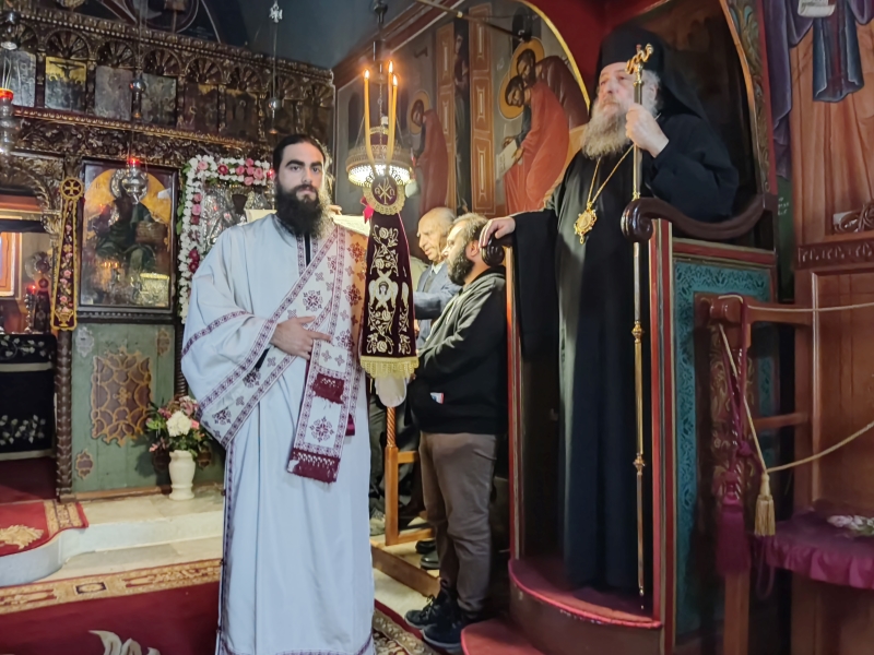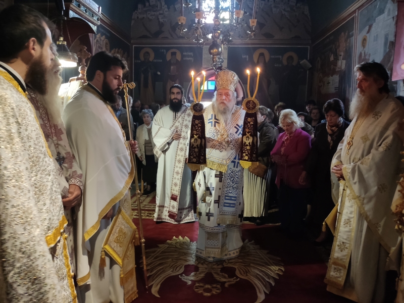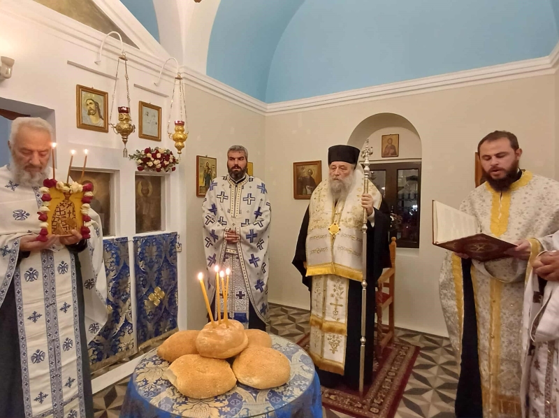Τον Σεβασμιώτατο πλαισίωσαν ο Πρωτοπρ. π. Κωνσταντίνος Λιανός, ο Σακελλάριος π. Ευστάθιος Βασιλάκης, ο Οικ. π. Νικόλαος Κασμάς και ο Πρεσβ. π. Παναγιώτης Σιαχάμης.
