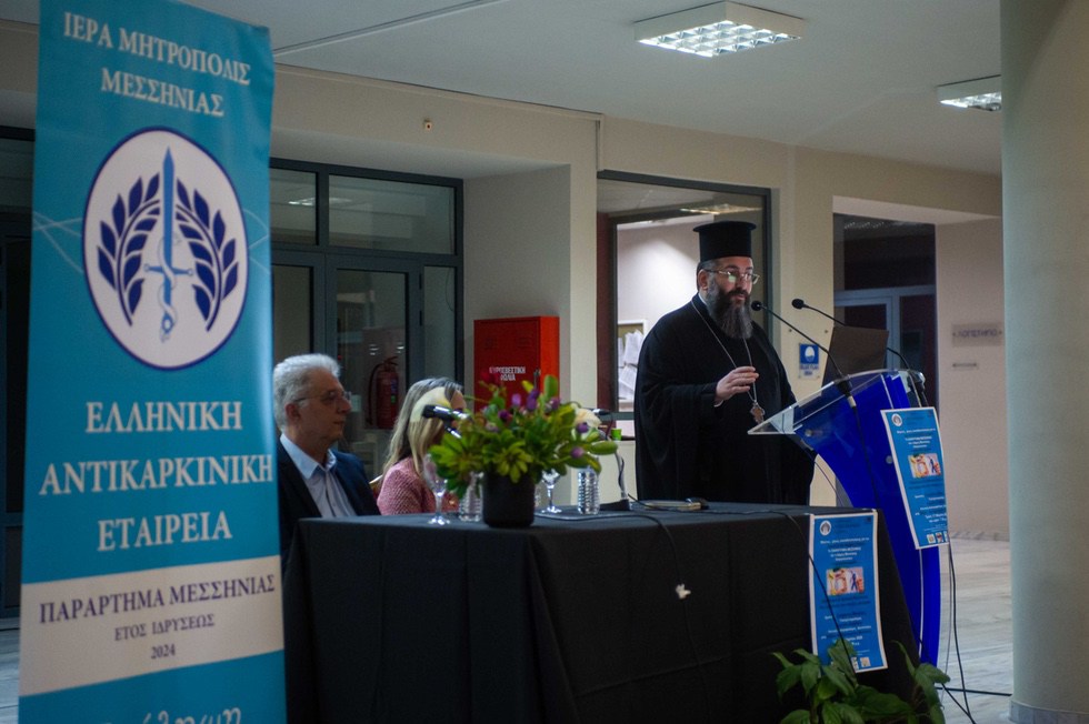 Ακολούθως έλαβε τον λόγο ο Πρόεδρος του Παραρτήματος Μεσσηνίας της Ελληνικής Αντικαρκινικής Εταιρείας, Πρωτοπρεσβύτερος Κωνσταντίνος Ανδριόπουλος, εκφράζοντας την ευγνωμοσύνη του προς το Σεβασμιώτατο και τον Πρωτοσύγκελλο για την από μέρους τους συμπαράσταση και αρωγή στο έργο της ενημέρωσης και πρόληψης σε θέματα υγείας.