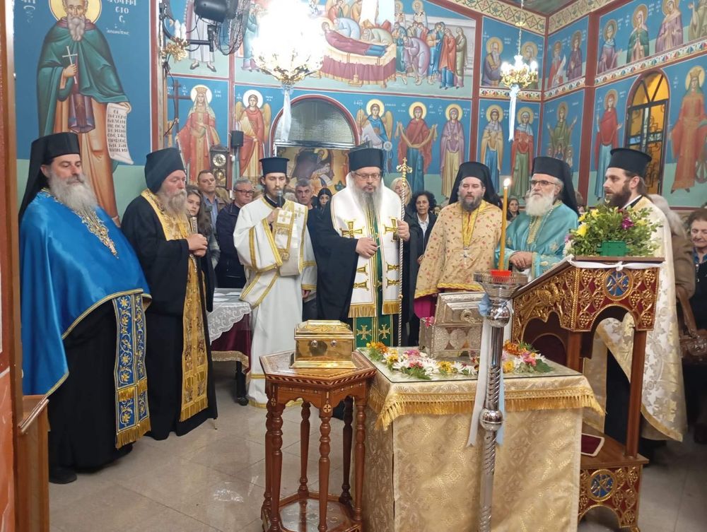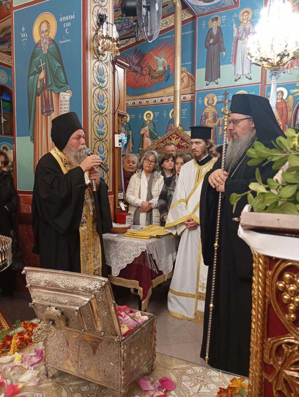 Μετά την ειδική δέηση, στη σύντομη προσλαλιά του, ο Ποιμενάρχης μας ευχαρίστησε τον Μητροπολίτη κ. Τιμόθεο για την ευλογία της αφίξεως του ιερού λειψάνου και τον Καθηγούμενο π. Μεθόδιο για τη μεταφορά του, τονίζοντας τη σπουδαιότητα της παρουσίας του ιερού αποτμήματος ανάμεσά μας, προτρέποντας όλους τους παρευρισκομένους να προσεύχονται στον Άγιο, προκειμένου να τους στυλώνει στην πίστη, στην υγεία, στο φρόνημα και να τους αξιώνει να γίνονται στύλοι αρετής, ευσεβείας, παιδείας και πνευματικής καλλιέργειας.