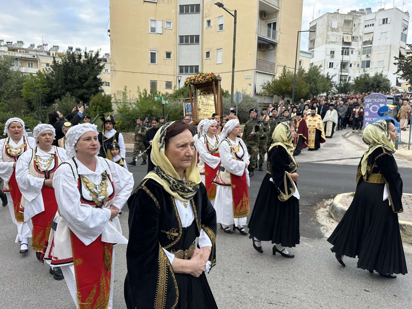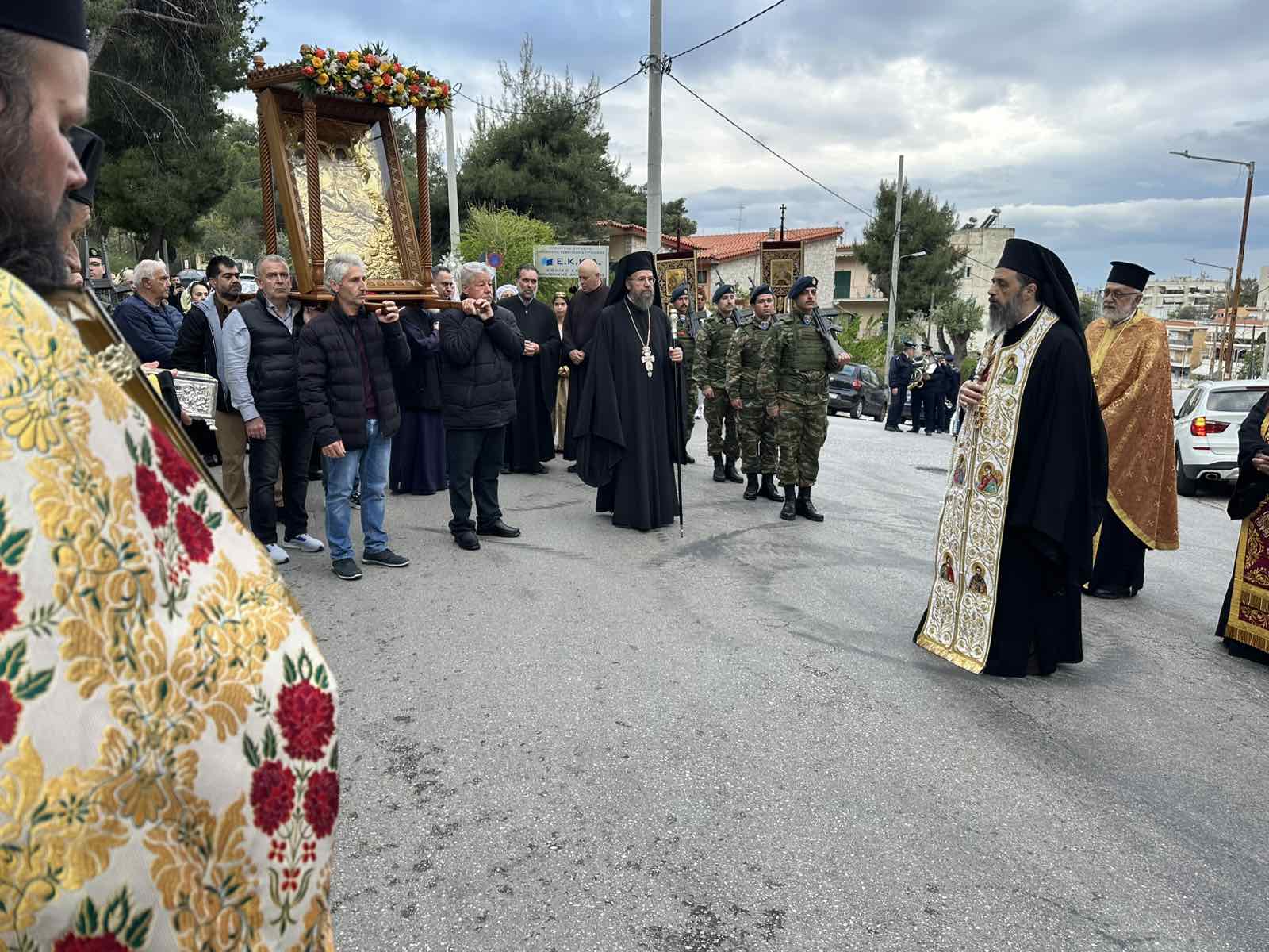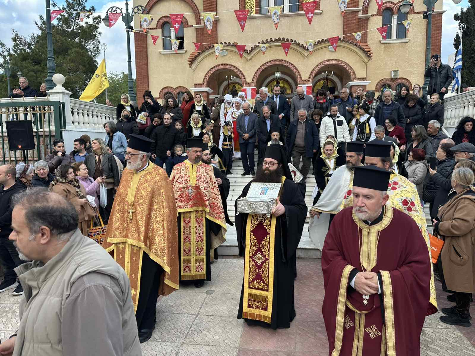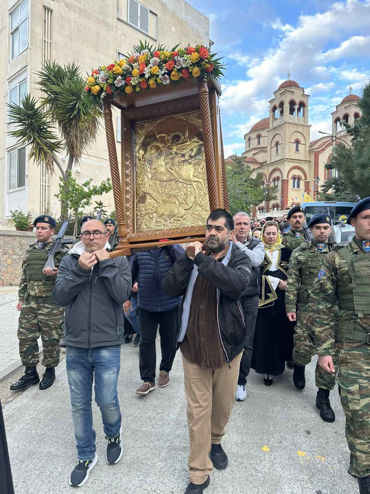 Μετά την ακολουθία, κλήρος και λαός, με προεξάρχοντα τον Ιεροκήρυκα της Μητροπόλεως Αρχιμανδρίτη π. Καλλίνικο Νικολάου, λιτάνευσαν την Εικόνα και τα Ιερά Λείψανα του Αγίου Γεωργίου στους δρόμους της ενορίας.