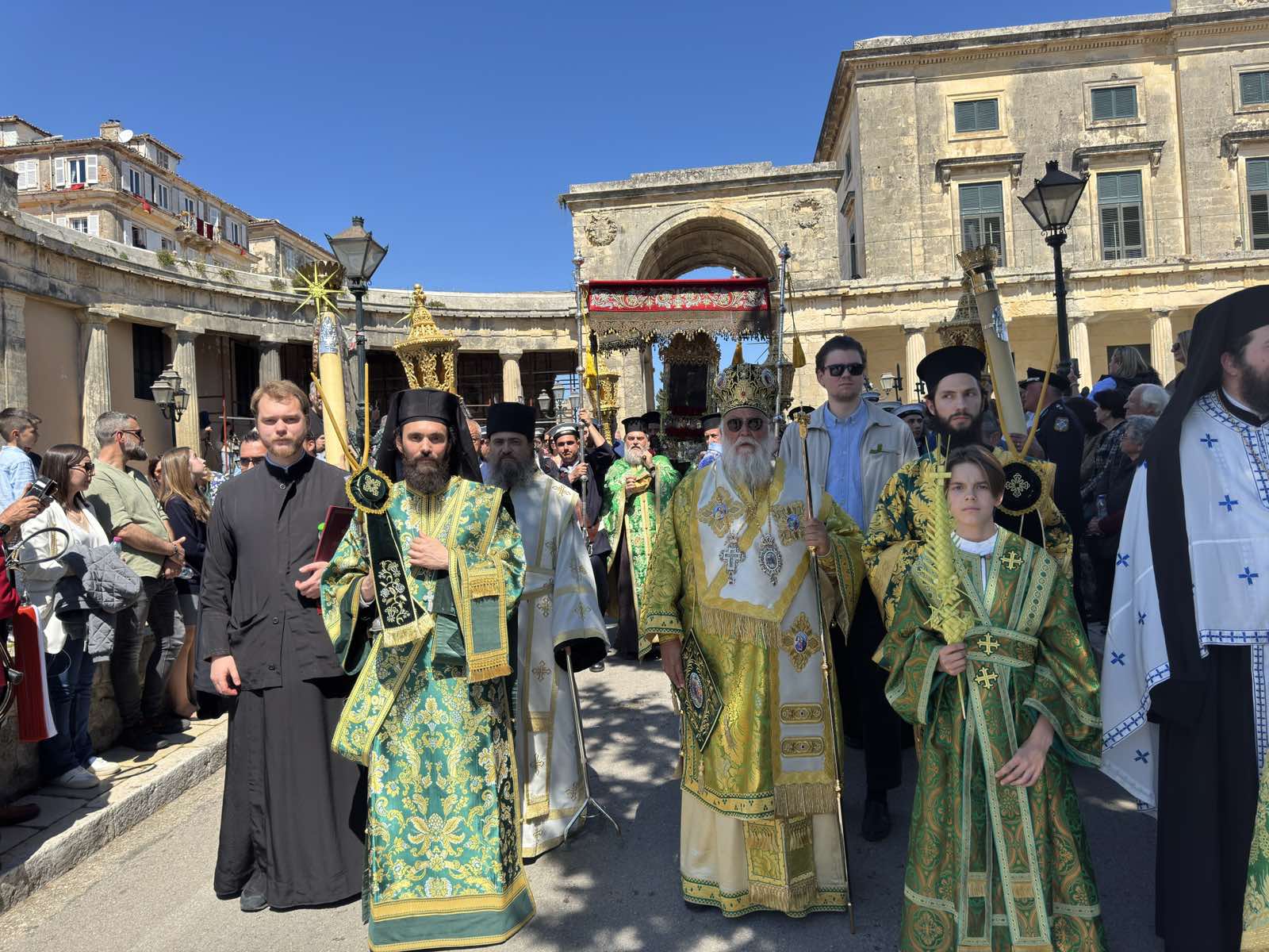 Με μεγαλοπρέπεια τελέστηκε στην Κέρκυρα το μεσημέρι της Κυριακής των Βαΐων 5 Απριλίου 2026 η καθιερωμένη λιτανεία του ιερού σκηνώματος του Αγίου Σπυρίδωνος, με αφορμή τη θαυματουργική διάσωση του νησιού από την πανώλη το 1630, με παρέμβαση του Αγίου.