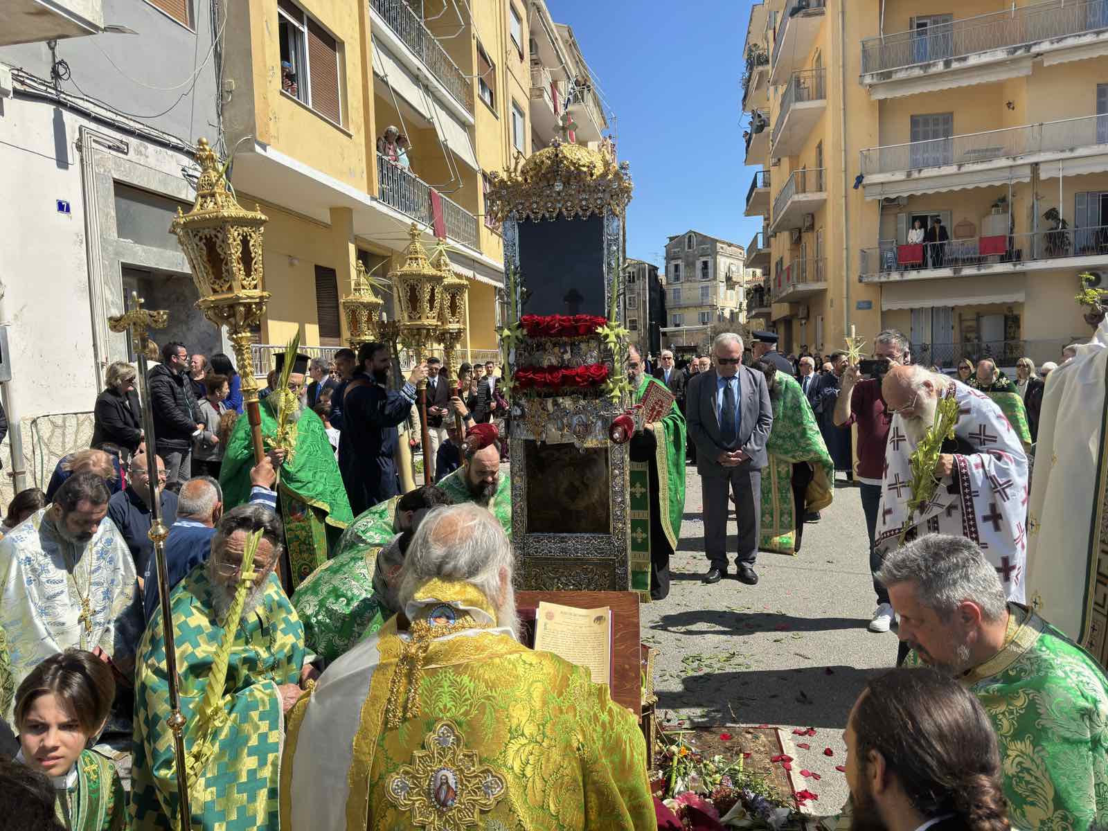 Με μεγαλοπρέπεια τελέστηκε στην Κέρκυρα το μεσημέρι της Κυριακής των Βαΐων 5 Απριλίου 2026 η καθιερωμένη λιτανεία του ιερού σκηνώματος του Αγίου Σπυρίδωνος, με αφορμή τη θαυματουργική διάσωση του νησιού από την πανώλη το 1630, με παρέμβαση του Αγίου.