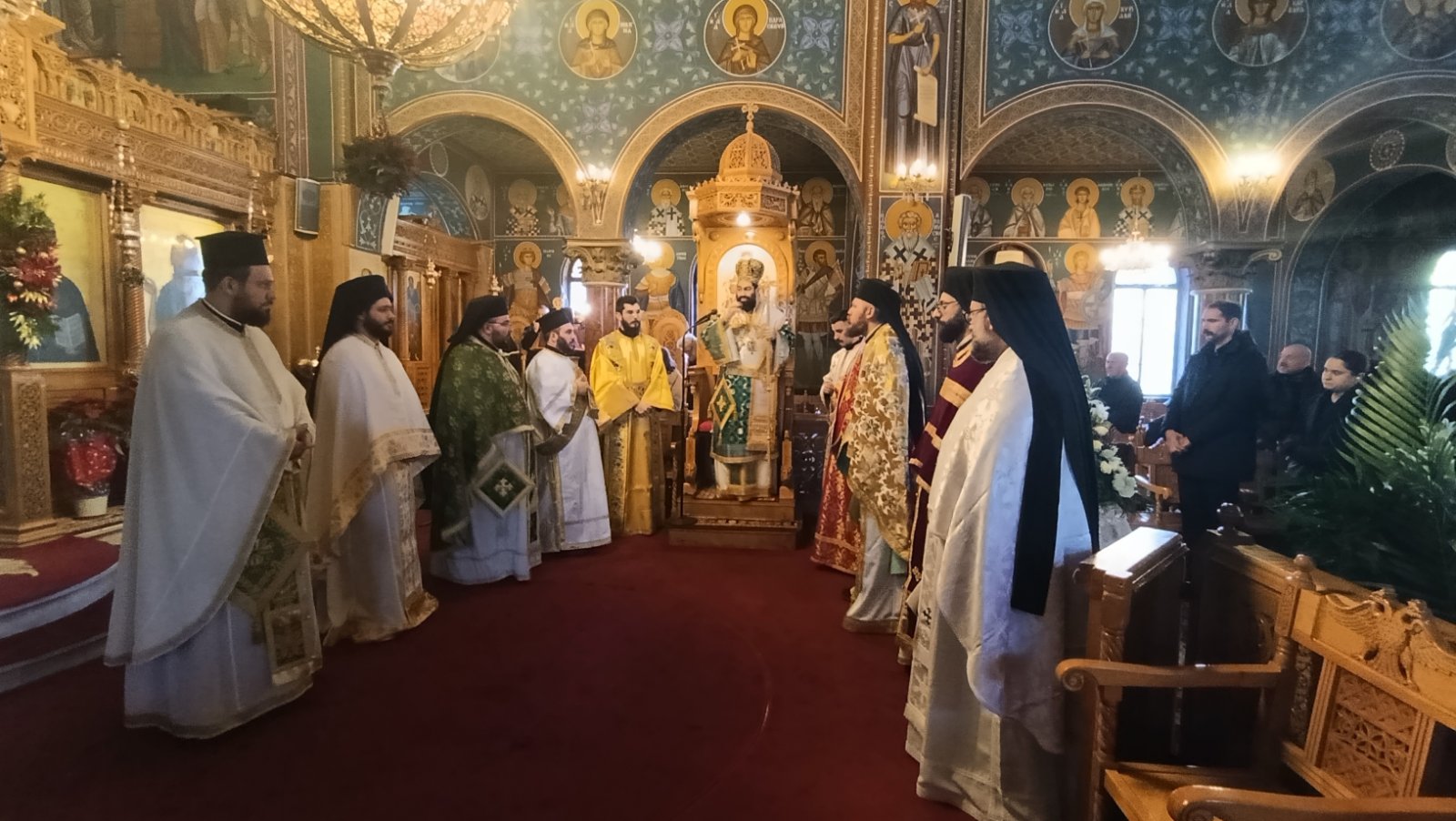 Με το σκήνωμα της Αικατερίνης Σιμιγδαλά – Γαβαλά, αγιογράφου και κατηχήτριας, στο κέντρο του ναού, χοροστάτησε στον όρθρο και προεξήρχε στην Θεία Λειτουργία ο επίσκοπος Ευρίπου Χρυσόστομος, συμπαραστατούμενος από τους αρχιμανδριτες Ευλόγιο Αντωνέλλο, Αρκάδιο Ραζνύ και τον εορτάζοντα Σεραφείμ Δημητρίου, τους νεοχειροτονηθέντες ιερομονάχους Χρυσόστομο Κρητικό και Μελέτιο Κριαρά, τον οικονόμο Γεώργιο Βάρσο και τους διακόνους Πέτρο Τζάρα και Χρήστο Αγγελάκη. Συμπροσευχήθηκαν ο επίσκοπος Βερενίκης Χρυσόστομος, οι αρχιμανδρίτες Ιάκωβος Δελλής, Ρωμανός Φωκάκης, Χρυσόστομος Καλαθάς και Σιλουανός Παπανικολάου καθώς και ο πρωθιερεύς Μιχαήλ Γιαννάτος.