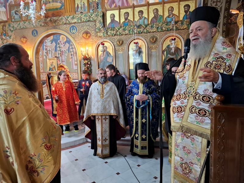Προ της λιτανείας, τα παιδιά των κατηχητικών της Ενορία με την καθοδήγηση του δραστήριου εφημέριου, πρωτοπρεσβ. Ιωάννου Γκρινιάρη και των συνεργατών του κατηχητών απέδωσαν το τροπάριο του αγίου, της Εορτής των Χριστουγέννων, αλλά και παραδοσιακά κάλαντα της Πατρίδος μας. Τέλος, τα παιδιά προσέφεραν στον Σεβασμιώτατο μια εικόνα της Παναγίας αγιογραφημένη από το εργαστήρι αγιογραφίας της Ενορίας.