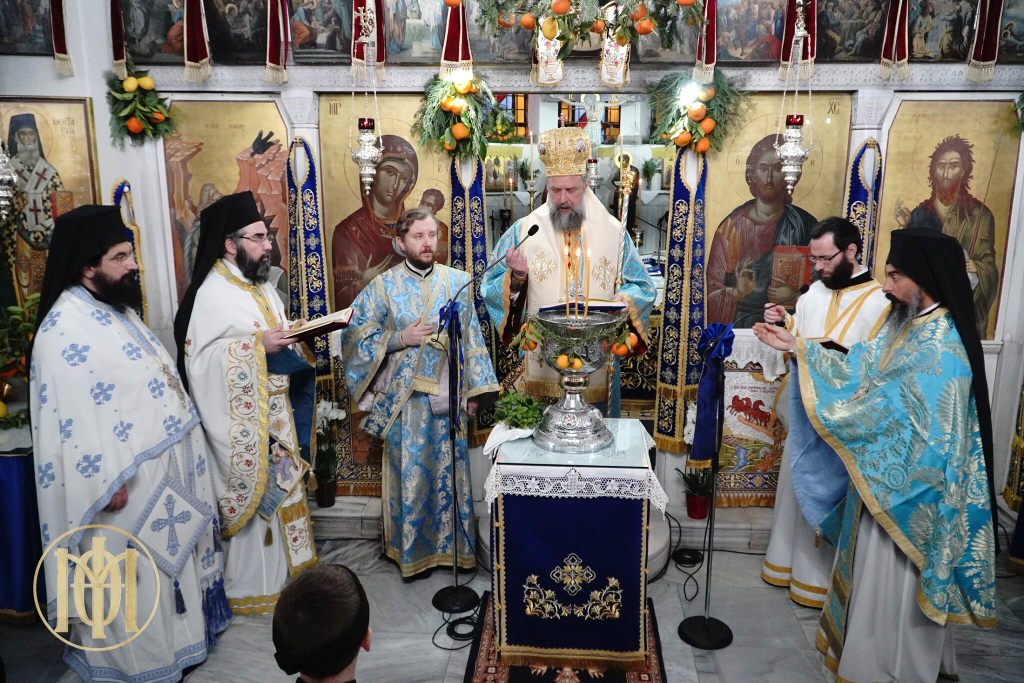 Πριν από την απόλυση ο Ποιμενάρχης μας, με τη συμμετοχή των συλλειτουργών ιερέων, τέλεσε την Ακολουθία του Μεγάλου Αγιασμού, κατά τη διάρκεια της οποίας κήρυξε τον θείο λόγο, αναφερόμενος στην ευαγγελική περικοπή, που αναγνώσθηκε στη Θεία Λειτουργία, και στο κοσμοσωτήριο γεγονός της Θείας Επιφανείας.