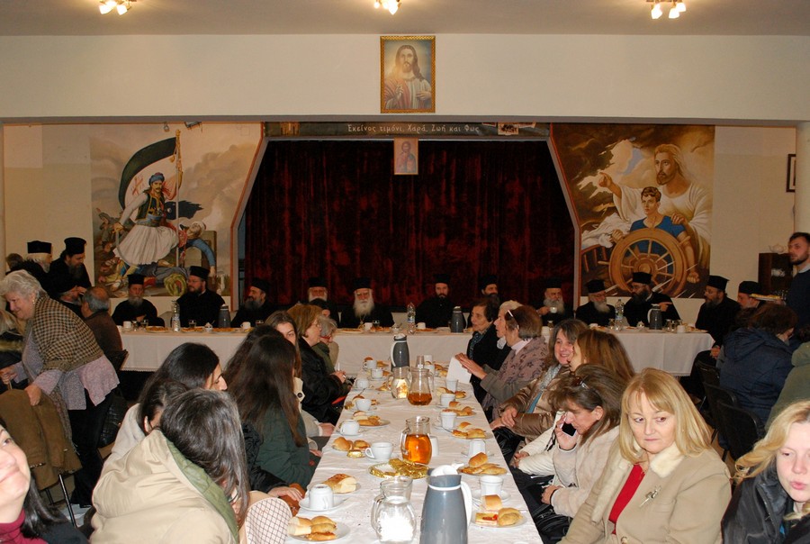 Μετά τήν ἀκολουθία τοῦ Εσπερινοῦ, στόν ὁποῖο χοροστάτησε ὁ Σεβασμ. Μητροπολίτης μας, ἀπευθυνόμενος στίς Ἐρανίστριες ξεκίνησε τήν ὁμιλία του λέγοντας πώς «ἡ ἀποψινή μας συνάθροιση ἔχει τόν χαρακτήρα εὐχαριστίας καί δοξολογίας πρός τόν Κύριο γιατί μᾶς ἀξιώνει νά διακονοῦμε αὐτό τό ἔργο τῆς ἀγάπης». Τόνισε ἐπίσης πώς «ἐμεῖς προσφέρουμε τήν ἀγαθή μας προαίρεση, τό θέλημά μας. Ἐκεῖνος μᾶς δίνει τήν δύναμη καί τόν φωτισμό νά πραγματοποιοῦμε ὅ,τι ἀκριβῶς σύμφωνα μέ τό θέλημά Του ὀφείλουμε νά πράξουμε καί ὅτι δέν ὑπάρχει τίποτε πιό σημαντικό ἀπό τό ἔργο τῆς διακονίας τῆς ἀγάπης».