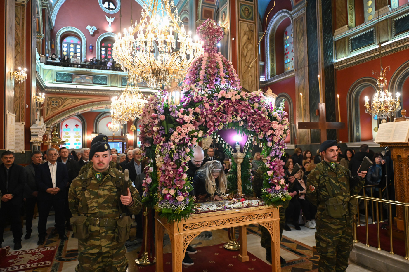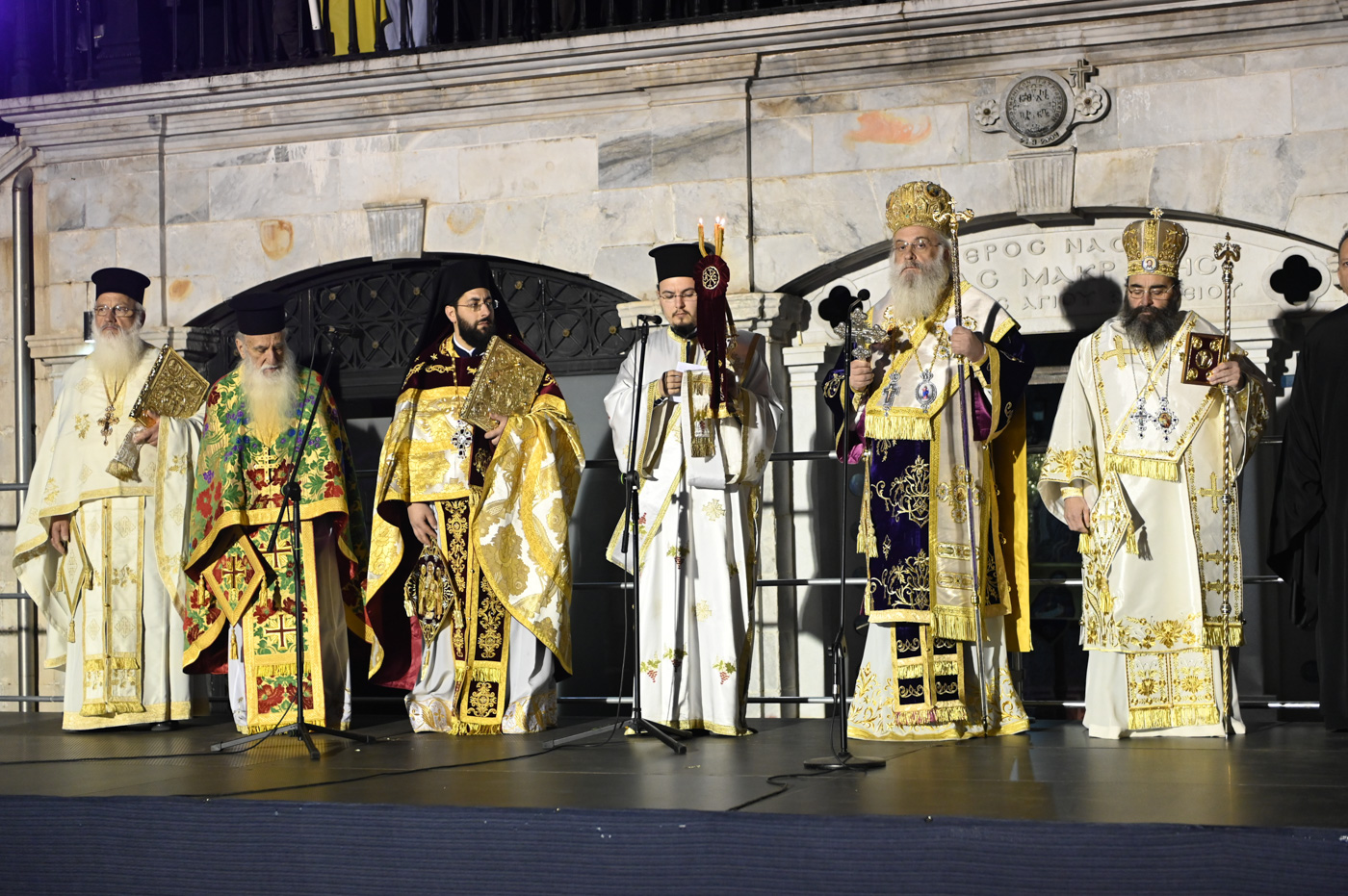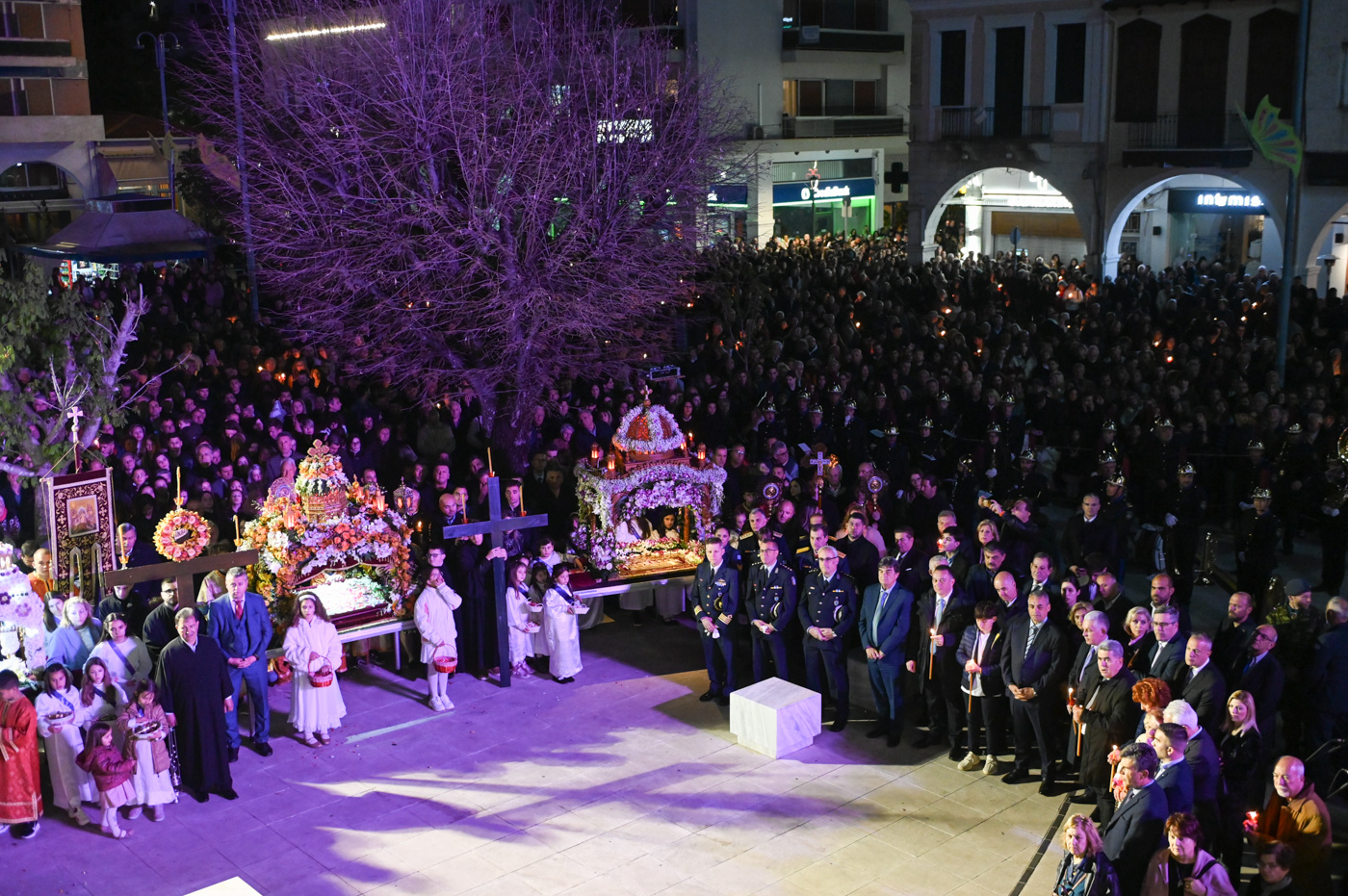 Ακολούθως, τελέσθηκε η περιφορά του Επιταφίου πέριξ του Μητροπολιτικού Ναού, όπου έμπροσθεν αυτού, στην κεντρική πλατεία πραγματοποιήθηκε η συνάντηση των Επιταφίων ενοριών της Τρίπολης. Ο Μητροπολίτης κ. Επιφάνιος, συμπαραστατούμενος από τον Θεοφιλ. Επίσκοπο Τεγέας και από Ιερείς ανέπεμψαν δέηση ενώπιον πλήθους πιστών που κατέκλυσαν την κεντρική πλατεία.