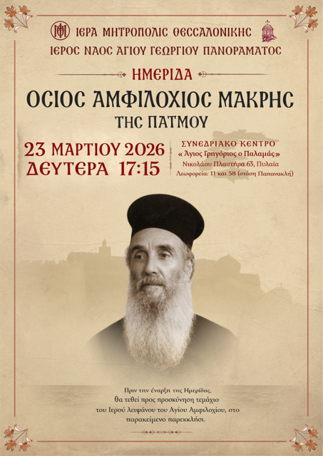 Συγκεκριμένα, την προσεχή Δευτέρα, 23η Μαρτίου 2026 στο Αμφιθέατρο του Εκπαιδευτικού και Πολιτιστικού Ιδρύματος της Ιεράς Μητροπόλεως Θεσσαλονίκης «Άγιος Γρηγόριος ο Παλαμάς» (Νικολάου Πλαστήρα 65 – περιοχή Χαριλάου), θα πραγματοποιηθεί, με την ευλογία του Μητροπολίτου Θεσσαλονίκης κ. Φιλοθέου, από τον ενοριακό Ιερό Ναό του Αγίου Γεωργίου Πανοράματος σε συνεργασία με νέους και νέες, φοιτήτριες και φοιτητές της Θεολογικής Σχολής και άλλων Σχολών του Α.Π.Θ. αγιολογική Ημερίδα, αφιερωμένη στον Όσιο Αμφιλόχιο Μακρή.
