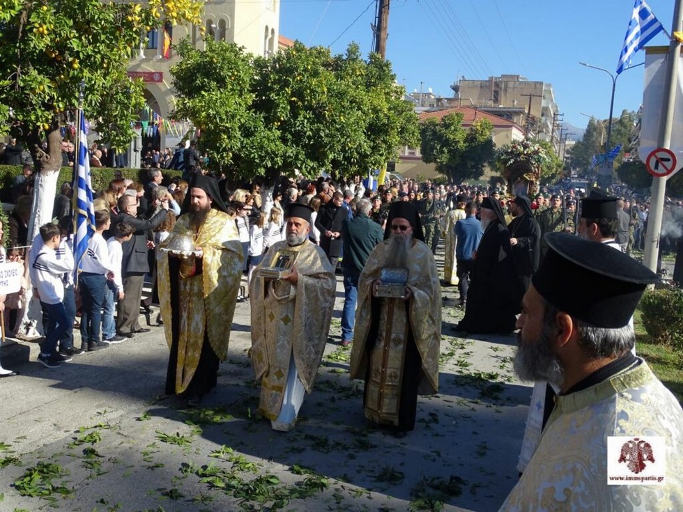 Απευθυνόμενος στον ιερό κλήρο, τους επίσημους προσκεκλημένους, τους τοπικούς άρχοντες και τον ευσεβή λαό, που είχαν κατακλύσει τον Ναό και τον περιβάλλοντα χώρο, ο Παναγιώτατος Οικουμενικός Πατριάρχης επισήμανε αρχικά ότι ο Κύριος θέτει ως Αρχή και Κατάληξη του Ευαγγελίου Αυτού την κλήση για μετάνοια, η οποία αποβαίνει το ανεκτίμητο δώρο του Θεού προς την Ανθρωπότητα. Την μετάνοια είχε ως πυρήνα του κηρύγματός του και ο Πολιούχος της Σπάρτης, τόνισε ο Παναγιώτατος, ο οποίος παράλληλα δίδασκε με τον λιτό και ενάρετο βίο του την πίστη, την αδιάλειπτη προσευχή, την θυσιαστική αγάπη και την ταπείνωση. Ακολούθως, ο Προκαθήμενος της Ορθοδοξίας συνεχάρη τον Σεβ. Ποιμενάρχη μας για την επί εξηκονταετία λαμπρή ιερατική του πορεία και για την επί σαράντα πέντε σχεδόν έτη πολύκαρπη και καλλίκαρπη αρχιερατική του διακονία. Επίσης, ευχαρίστησε θερμά για την ευγενική πρόσκληση, την ανώτατη τιμητική διάκριση της τοπικής Εκκλησίας που του απενεμήθη, αλλά και για την εγκάρδια φιλοξενία. Ολοκληρώνοντας, απευθυνόμενος στον ευσεβή λαό τόν πρότρεψε να ασπασθεί την ‘’εν Χριστώ ζωή’’ αναφέροντας χαρακτηριστικά: <<Χαίρεται εν Κυρίω πάντοτε, γρηγορείτε, στήκετε εν τη πίστει, ανδρίζεσθε, κραταιούσθε>>