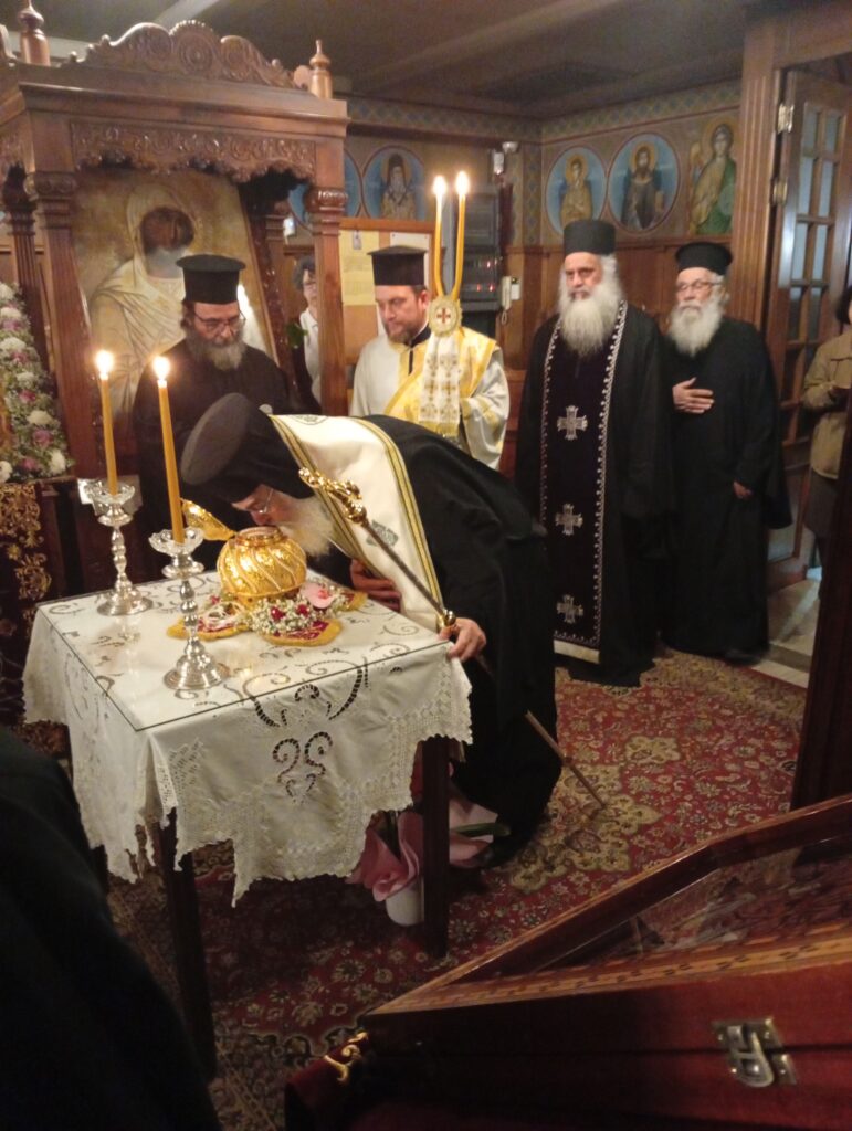 Κατά τήν διάρκεια τοῦ Ἑσπερινοῦ οἱ πιστοί εἶχαν τήν δυνατότητα νά προσκυνήσουν ἀπότμημα ἱεροῦ λειψάνου τοῦ προσφάτως ἁγιοκαταταχθέντος Ὁσίου Πατρός Ἐφραίμ τοῦ Κατουνακιώτη πού ἐκόμισε ὁ ὁμιλητής.
