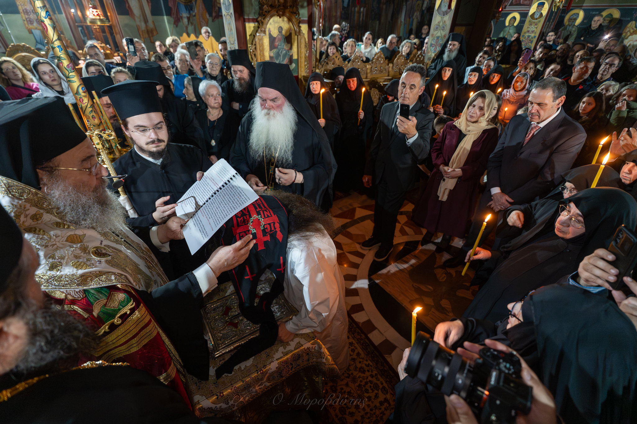 Τον Σεβασμιώτατο πλαισίωσε ο Πρωτοσύγκελλος της Ιεράς Μητροπόλεως Παν. Αρχιμ. π. Δωρόθεος Ζέρβας, ακολουθούμενος από πλειάδα Κληρικών, Μοναχών και Μοναζουσών, τόσον εκ της οικείας Ιεράς Μητροπόλεως, όσον και εξ Αγίου Όρους και ομόρων άλλων Ιερών Μητροπόλεων. Πλήθος Λαού με επικεφαλής τον Πρόεδρο του Παλαιοχωρίου, γενετείρας της νεοκαρείσης Μοναχής, κ. Γρηγόριο Κατσιαρμά, προσήλθε και κατέκλυσε κυριολεκτικώς την Ιερά Μονή για να προσευχηθεί και να ενισχύσει τον φέρελπι αυτό βλαστό της Εκκλησίας στο νέο της ξεκίνημα – τόλμημα.