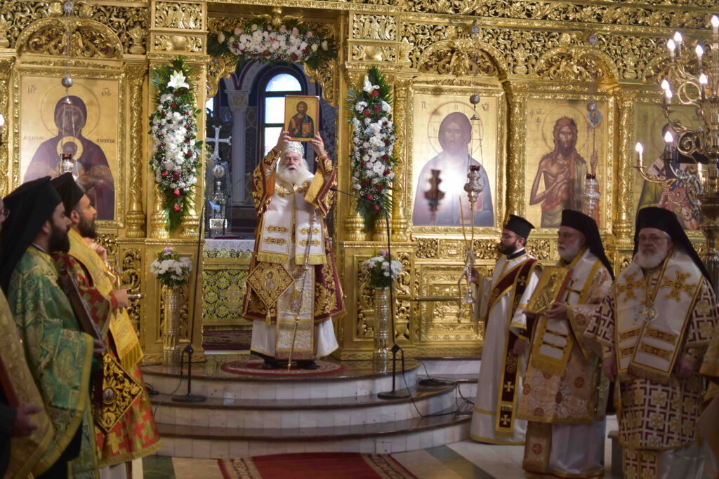 Συνεχίζοντας την επίσημη επίσκεψή του στην Ιερά Μητρόπολη Διδυμοτείχου, Ορεστιάδος και Σουφλίου η Α.Θ.Μ. ο Πάπας και Πατριάρχης Αλεξανδρείας και πάσης Αφρικής κ. Θεόδωρος, την Κυριακή της Ορθοδοξίας, 1η του μηνός Μαρτίου ε.έ., ιερούργησε στον εμβληματικό Ιερό Καθεδρικό Ναό Παναγίας Ελευθερωτρίας στο Διδυμότειχο, πλαισιούμενος από τους Σεβ. Μητροπολίτες Γουϊνέας κ. Γεώργιο και Μέμφιδος κ. Νικόδημο, τον Θεοφιλ. Επίσκοπο Μαρεώτιδος κ. Δαμασκηνό και τον επιχώριο Μητροπολίτη κ. Δαμασκηνό. Πρό του πέρατος της Πατριαρχικής Θείας Λειτουργίας λιτανεύθησαν, κατά την εκκλησιαστική τάξη, οι ιερές εικόνες και ανεγνώσθη το Συνοδικό της ημέρας. Ο Μακαριώτατος, επ’ ευκαιρία της εορτής του Θριάμβου της Ορθοδοξίας και εις ανάμνηση της αναστηλώσεως των ιερών εικόνων, μίλησε επίκαιρα στο πολυπληθές εκκλησίασμα. [Ακολουθεί η ομιλία του Μακαριωτάτου].