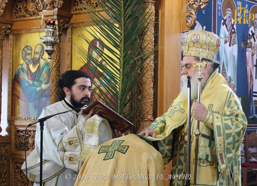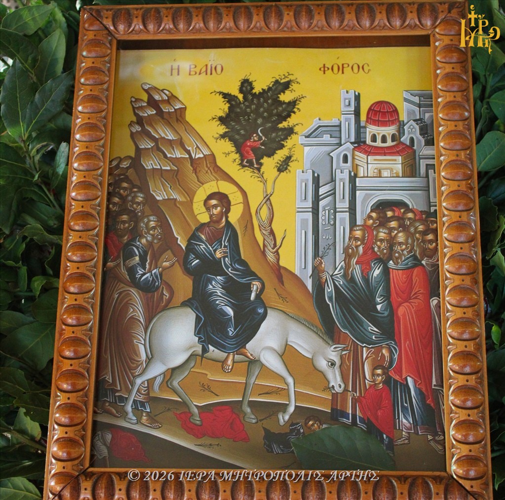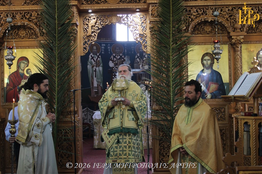 Κατά τη διάρκεια της Θείας Λειτουργίας, ο Σεβασμιώτατος ευλόγησε, σύμφωνα με το Εκκλησιαστικό Τυπικό, τα βάια, τα οποία διενεμήθησαν στους πιστούς, μεταφέροντας το μήνυμα της νίκης του Χριστού, που όμως περνά μέσα από την ταπείνωση και τη θυσία.