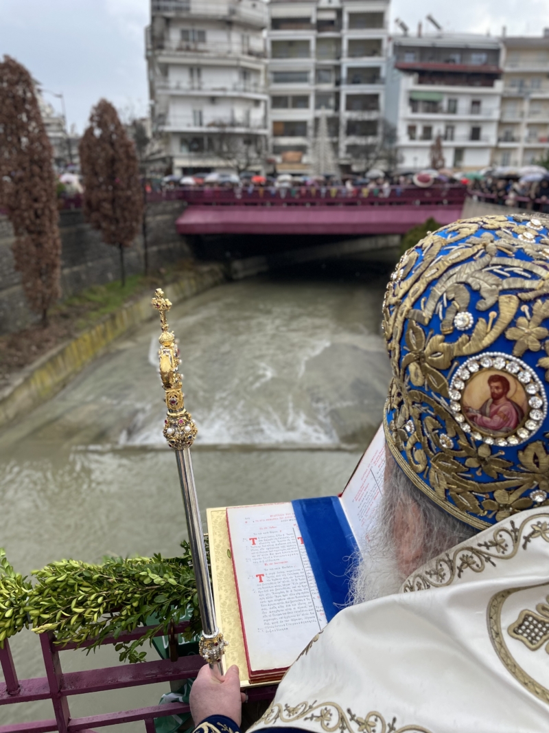 Στη συνέχεια, ο Ποιμενάρχης μας μετέβη στον ποταμό Γρεβενίτη, όπου τελέσθηκε η καθιερωμένη Ακολουθία του Αγιασμού των Υδάτων και πραγματοποιήθηκε η ρίψη του Τιμίου Σταυρού, μέσα σε κλίμα συγκίνησης και πνευματικής χαράς.