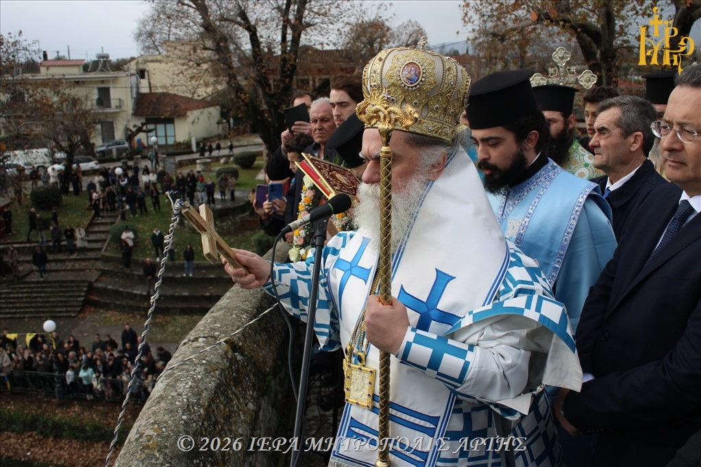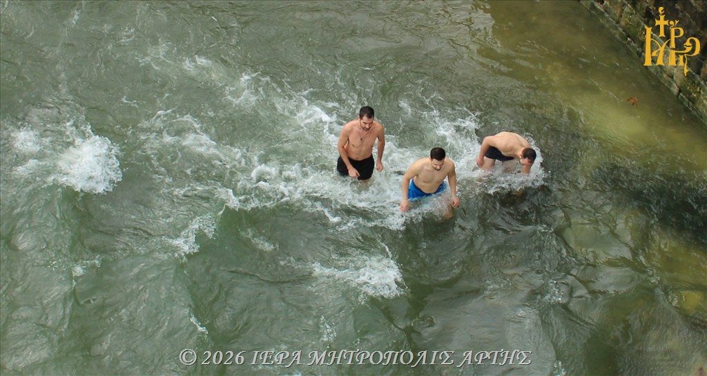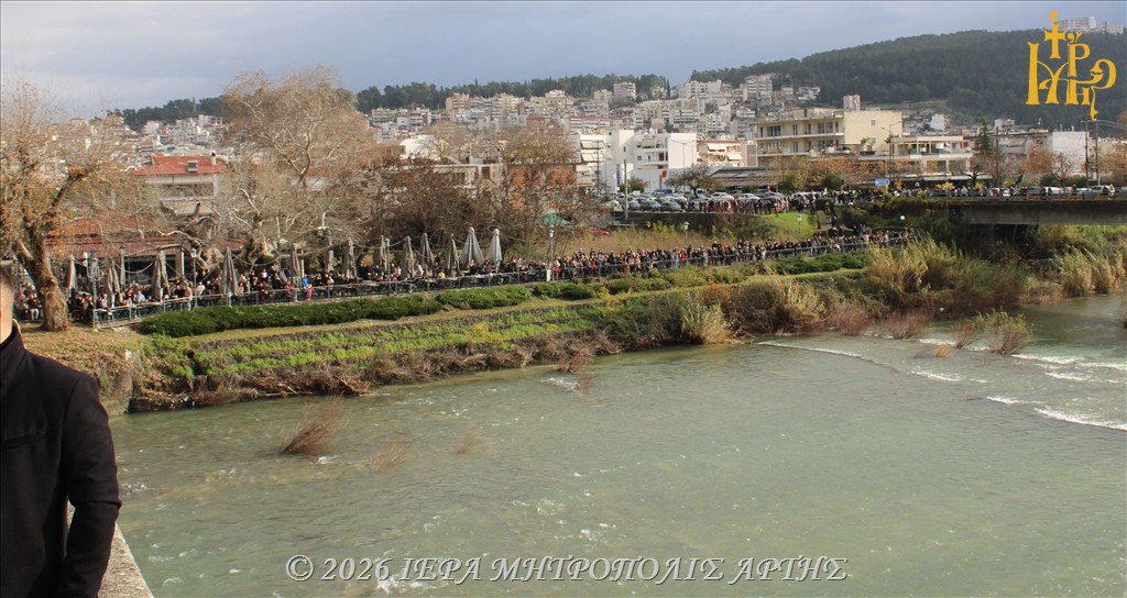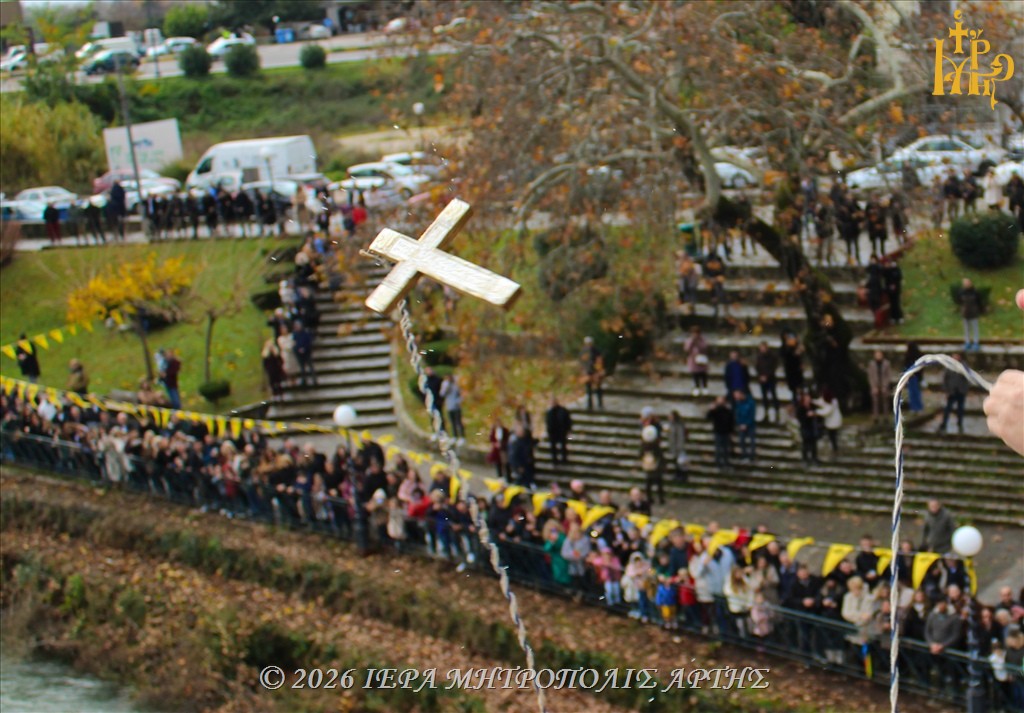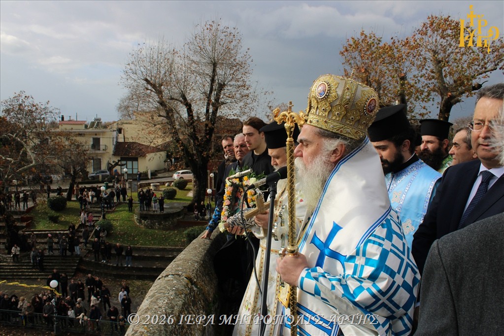 Στη συνέχεια, από το ιστορικό και θρυλικό Γεφύρι της Άρτας, ο Σεβασμιώτατος ετέλεσε την καθιερωμένη τελετή της κατάδυσης του Τιμίου Σταυρού στα νερά του ποταμού Αράχθου, μέσα σε κλίμα κατάνυξης.