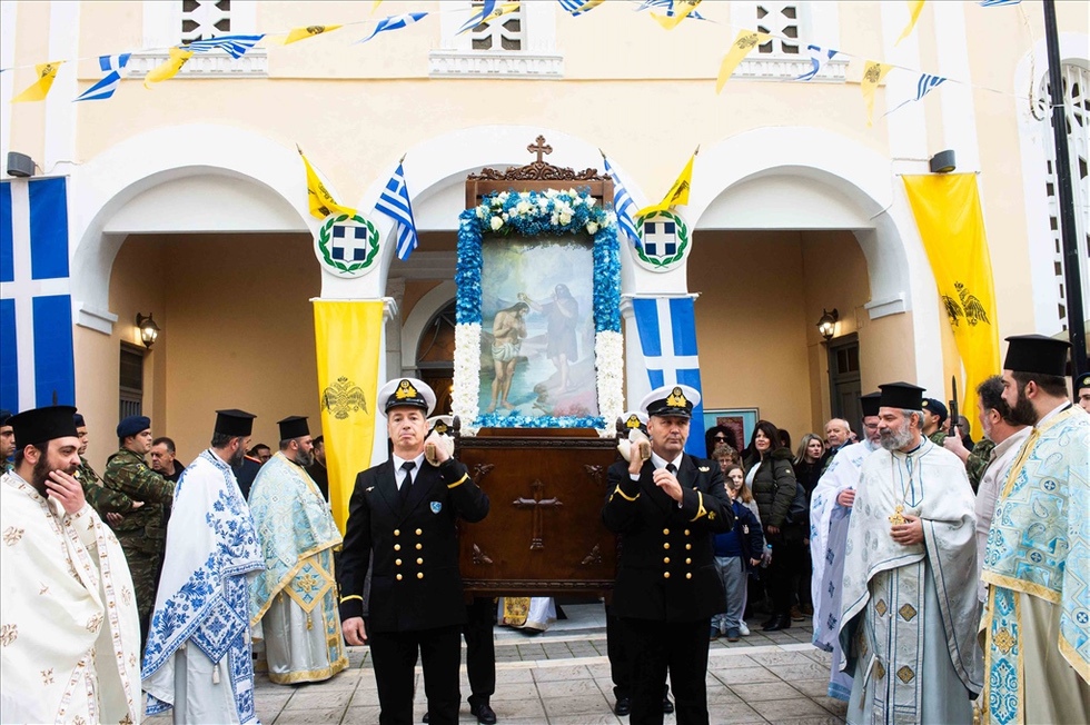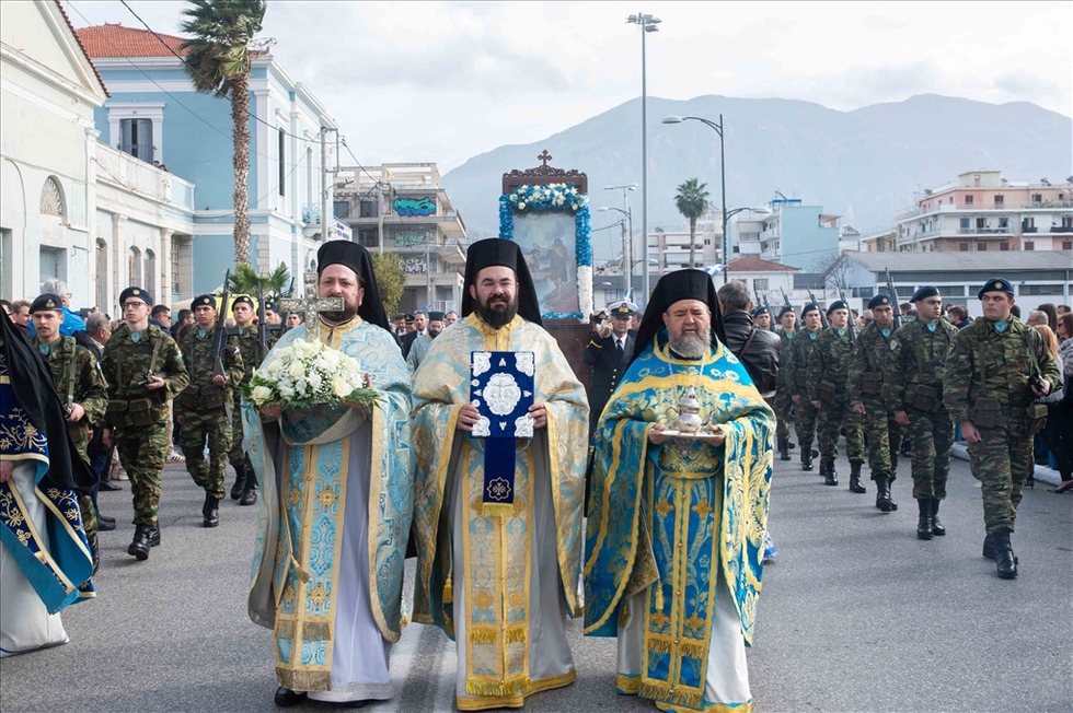 Τιμές απέδωσαν στρατιωτικό άγημα του 9ου Σ.Π. και η φιλαρμονική του Δήμου Καλαμάτας, ενώ την Εικόνα της Βαπτίσεως του Χριστού έφεραν επ’ ώμοις, άνδρες του Λιμενικού Σώματος.