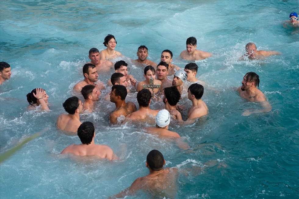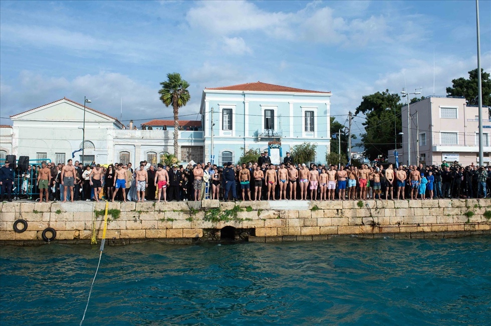 Πλειάδα κολυμβητών έπεσαν στη θάλασσα για να ανασύρουν τον Τίμιο Σταυρό. Τυχερός στάθηκε ο μαθητής του 3ου Γενικού Λυκείου Ιωάννης Ζησιμόπουλος.