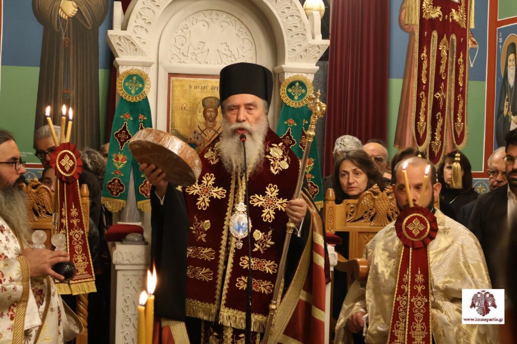 Αφού εψάλλησαν τα εγκώμια του Αγίου ενώπιον του αποτμήματος των ιερών λειψάνων του και ευλογήθηκαν οι άρτοι, ο σεπτός Ποιμενάρχης μας χειροθέτησε Αναγνώστη έναν ευσεβή νέο της Ενορίας, τον Κώστα Τσιριγώτη, μαθητή Λυκείου. Ο Σεβασμιώτατος στη σύντομη προσλαλιά του, μίλησε με επαινετικά λόγια για το ήθος και τις ψαλτικές δυνατότητες του νέου Αναγνώστη, ενώ τον συμβούλευσε όταν ψέλνει να έχει στο νου και την καρδιά του μόνο τον Τριαδικό Θεό, την Παναγία και τους Αγίους που εξυμνεί, χωρίς ίχνος έπαρσης. Παράλληλα, συνεχάρη τους γονείς του, τον πνευματικό του πατέρα και εφημέριο της Ενορίας, Πανοσιολογιώτατο Αρχιμανδρίτη π. Σεραφείμ Κοσμά, ο οποίος έχει καταφέρει να έχει κοντά του τους νέους και τις νέες της περιοχής, καθώς και τους δασκάλους του στην ψαλτική. Ολοκληρώνοντας, ευχήθηκε στον χειροθετηθέντα να έχει τη χάρη του Πανάγαθου θεού και να συνεχίσει με τον ίδιο ζήλο να πορεύεται στον δρόμο της αρετής και της μάθησης.