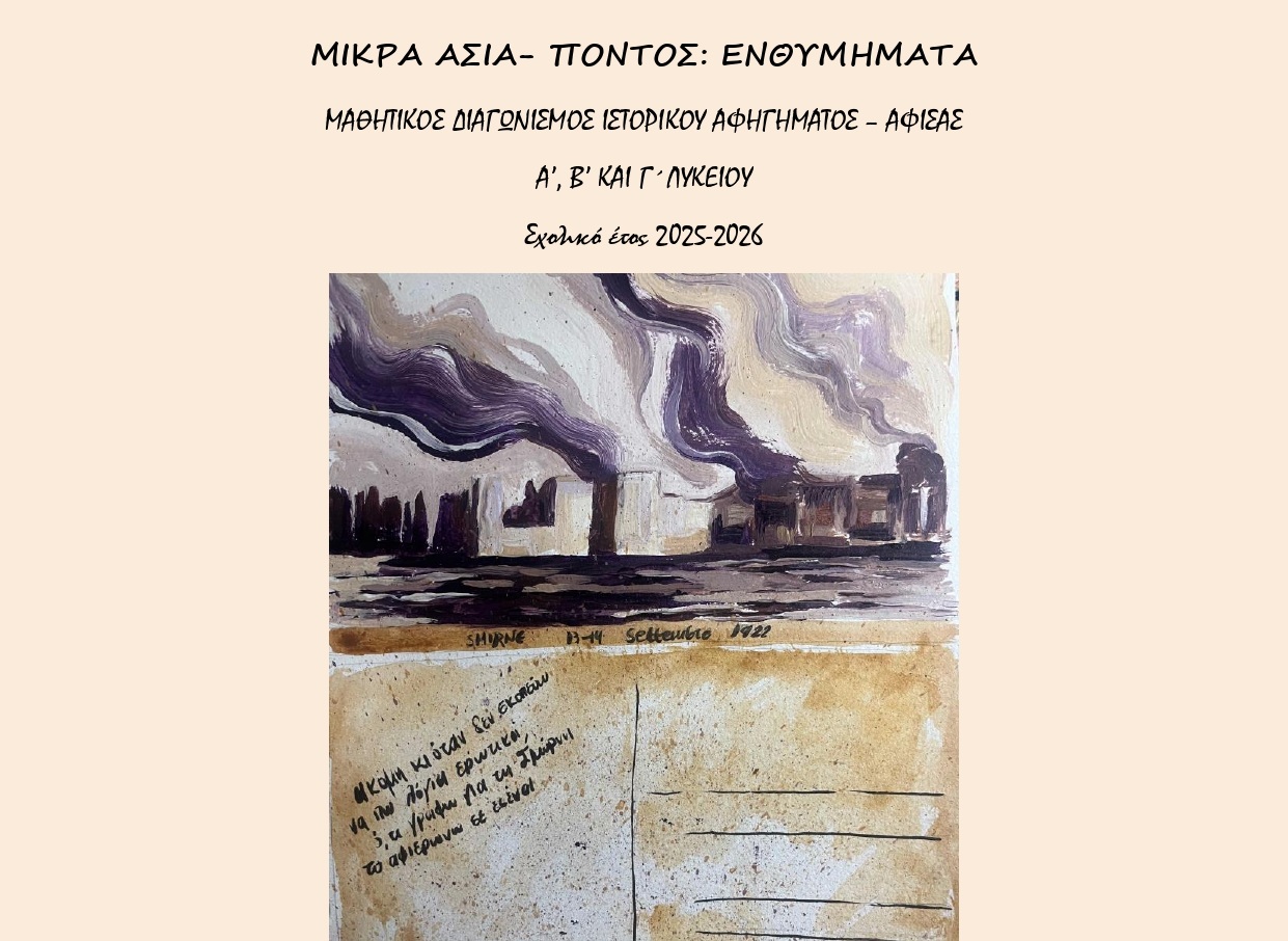 Η Ιερά Σύνοδος της Εκκλησίας της Ελλάδος, διά της Ειδικής Συνοδικής Επιτροπής Πολιτιστικής Ταυτότητος, η Γενική Γραμματεία Θρησκευμάτων του Υπουργείου Παιδείας, Θρησκευμάτων και Αθλητισμού και η Έδρα Ποντιακών Σπουδών του Τμήματος Ιστορίας και Αρχαιολογίας του Αριστοτελείου Πανεπιστημίου Θεσσαλονίκης συνδιοργανώνουν για το σχολικό έτος 2025-2026 τον 2ο Μαθητικό Διαγωνισμό δημιουργίας ιστορικού αφηγήματος και αφίσας με θέμα: «Μικρά Ασία – Πόντος: Ενθυμήματα».