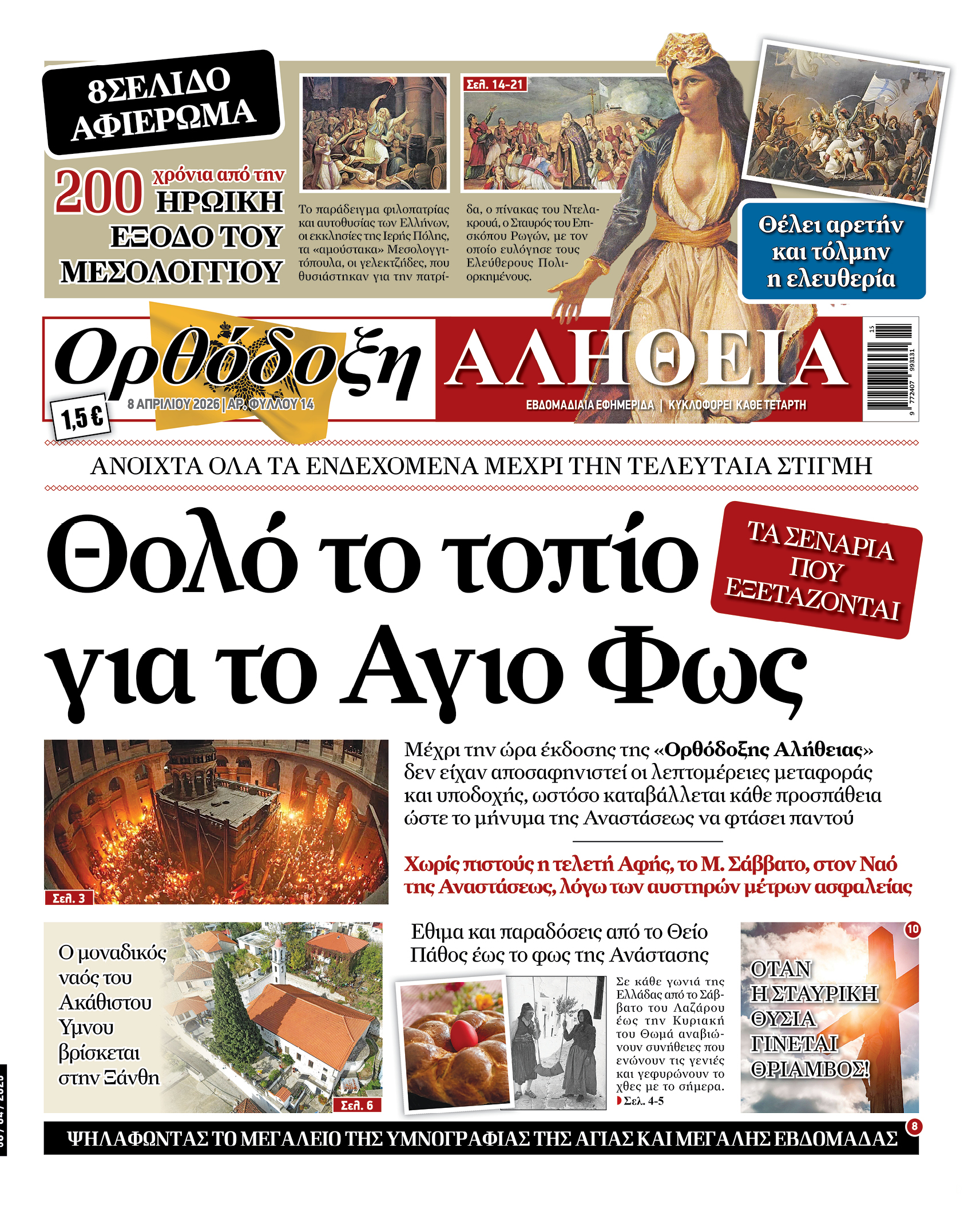 «Θολό το τοπίο για το Άγιο Φως» είναι ο βασικός τίτλος, καθώς μέχρι την ώρα έκδοσης δεν είχαν αποσαφηνιστεί πλήρως οι λεπτομέρειες για τη μεταφορά και την υποδοχή του στην Ελλάδα. Τα σενάρια που εξετάζονται είναι πολλά, ενώ καταβάλλονται προσπάθειες ώστε το μήνυμα της Αναστάσεως και της ελπίδας να φτάσει σε κάθε γωνιά της χώρας. Την ίδια ώρα, η τελετή της αφής στον Ναό της Αναστάσεως το Μεγάλο Σάββατο αναμένεται να πραγματοποιηθεί χωρίς την παρουσία πιστών, λόγω αυστηρών μέτρων ασφαλείας και περιορισμών.