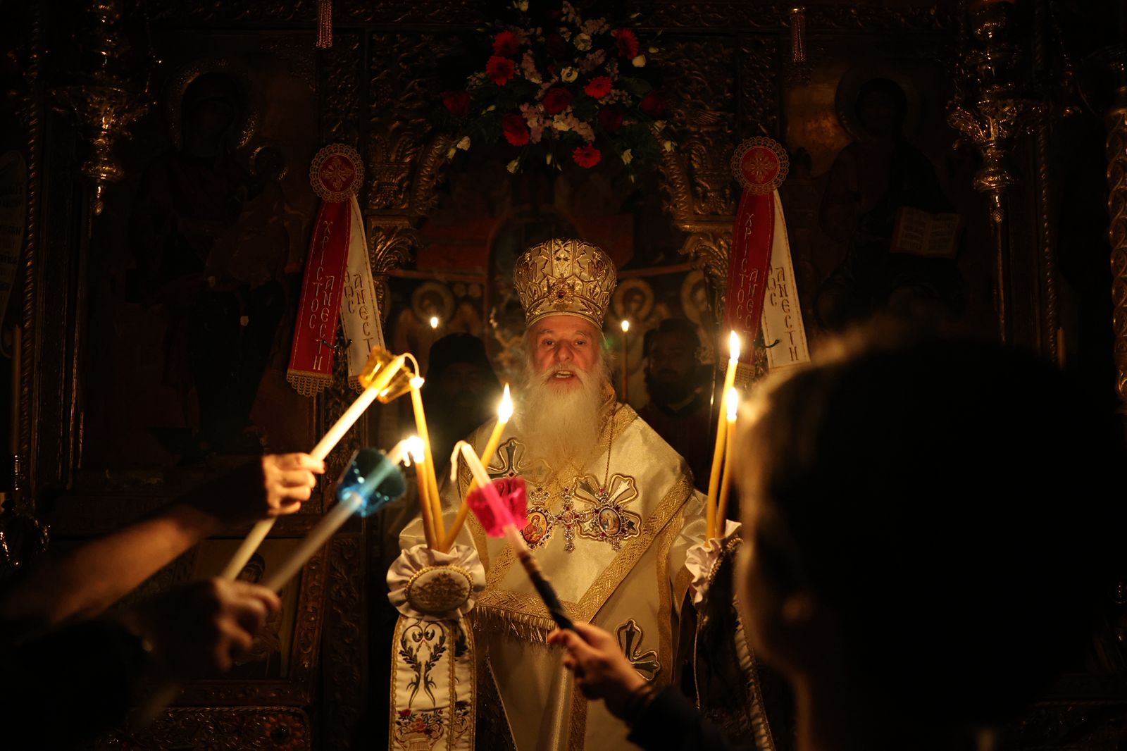 Μέσα στο σκοτάδι του ναού, μετά το πέρας της Παννυχίδος, ο Σεβασμιώτατος Μητροπολίτης Αυλώνος Χριστόδουλος μετέδωσε το Άγιο Φως στους πιστούς, απευθύνοντας το διαχρονικό κάλεσμα «Δεύτε λάβετε Φως».