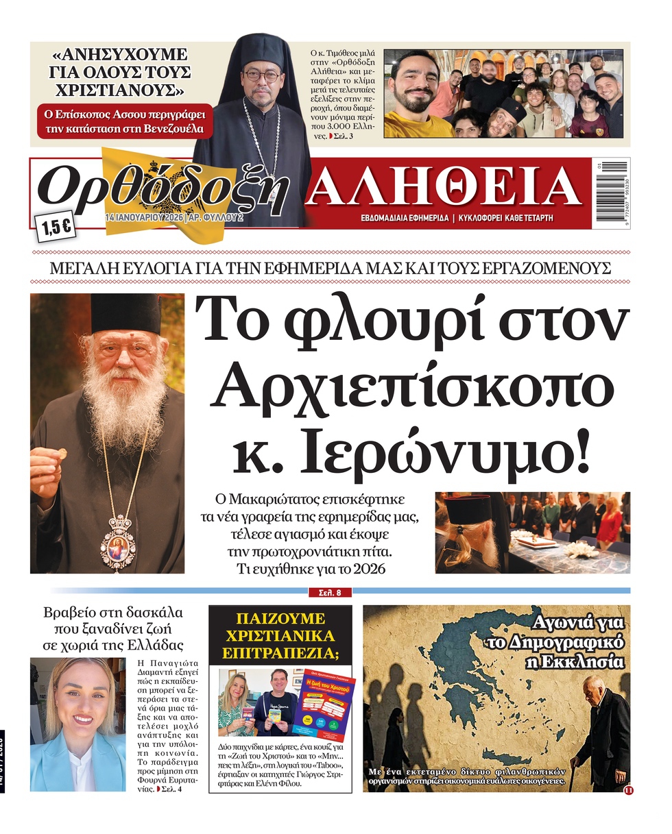 Στο τεύχος της “Ορθόδοξης Αλήθειας” που κυκλοφορεί αυτή την Τετάρτη στις 14/1 θα ξεφυλλίσετε σημαντικά θέματα που φωτίζουν την πίστη, την επικαιρότητα, την κοινωνία . Με σεβασμό στην αλήθεια και τον άνθρωπο, η εφημερίδα καταγράφει γεγονότα και πρόσωπα που προβληματίζουν, εμπνέουν και δίνουν ελπίδα.