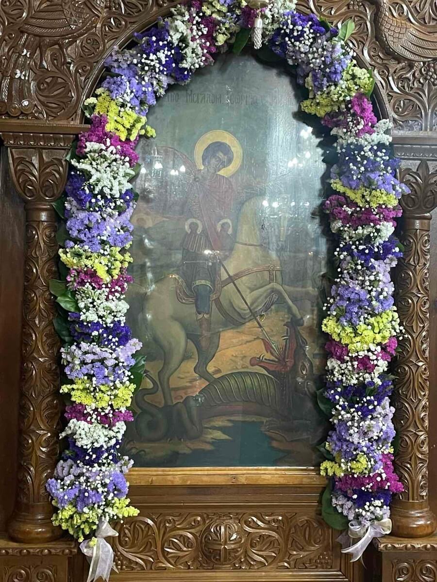Πλήθος ευσεβών χριστιανών προσήλθε στον Ιερό Ναό, για να συμμετάσχει προσευχητικά στη Θεία Λειτουργία και να τιμήσει τη μνήμη του Αγίου Μεγαλομάρτυρος Γεωργίου του Τροπαιοφόρου, αντλώντας πνευματική ενίσχυση από το παράδειγμα της ζωής και του μαρτυρίου του.