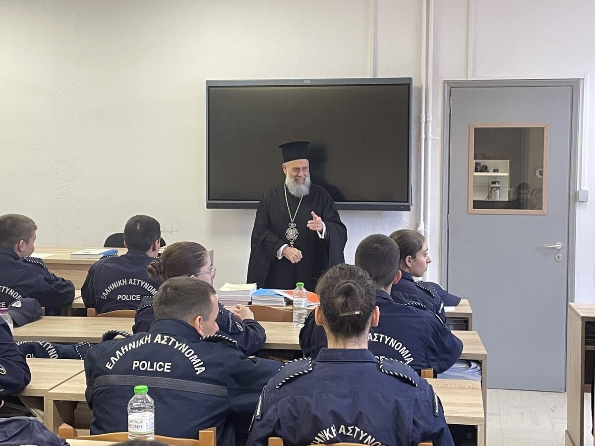 Ο Σεπτός μας Ποιμενάρχης μας είχε την ευκαιρία να επικοινωνήσει άμεσα με τους εκπαιδευόμενους, αναπτύσσοντας ζητήματα που άπτονται της πίστεως, της σύγχρονης κοινωνικής πραγματικότητας και των προκλήσεων που καλούνται να αντιμετωπίσουν οι νέοι άνθρωποι, ιδιαιτέρως μέσα στο πλαίσιο της αποστολής τους ως μελλοντικών στελεχών των Σωμάτων Ασφαλείας.