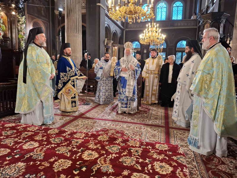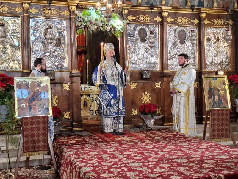 Ο Σεβασμιώτατος χοροστάτησε στον Όρθρο, προεξήρχε της Θείας Λειτουργίας και τέλεσε τον Μεγάλο Αγιασμό, πλαισιούμενος από Κληρικούς του.