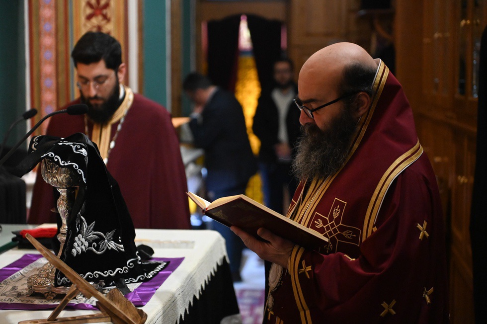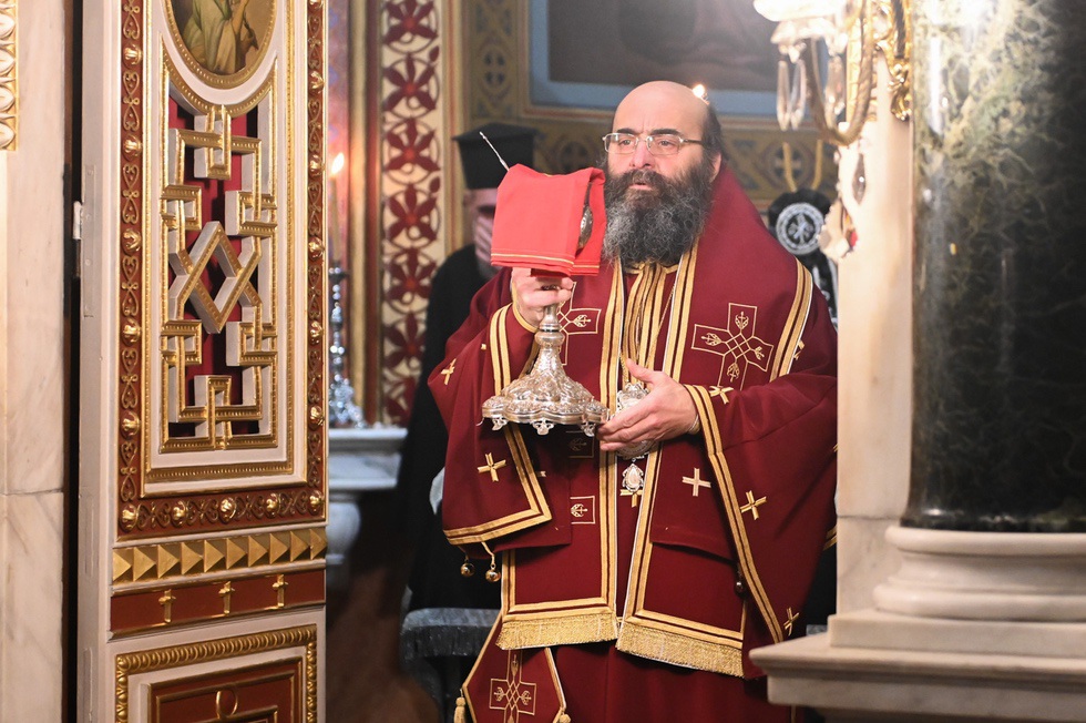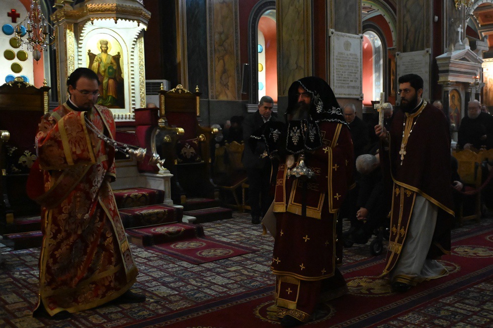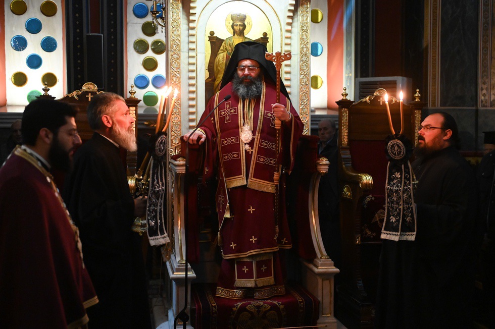 Την Προηγιασμένη Θεία Λειτουργία τέλεσε ο εορτάζων Θεοφιλ. Επίσκοπος Τεγέας κ. Θεόκλητος, συμπαραστατούμενος από τον Πρωτοσύγκελλο της Ιεράς