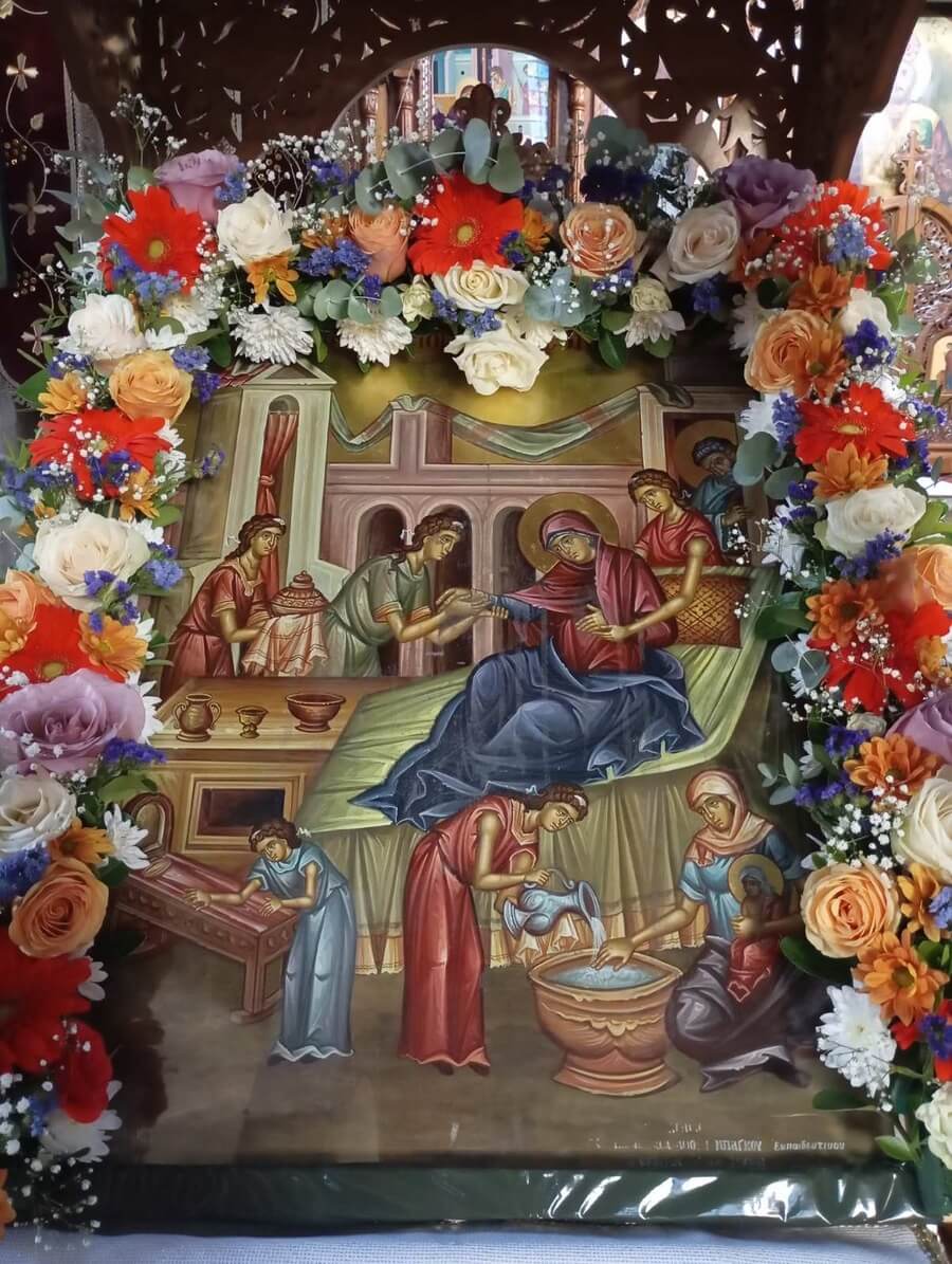 Αυτήν λοιπόν, αδελφοί, ας υμνήσουμε περιχαρώς και ας προσπαθήσουμε και στη ζωή μας όλα αυτά τα οποία βλέπουμε στο πρόσωπο της Παναγίας μας να τα μιμηθούμε. Εάν προσέξουμε με λίγο μεγαλύτερη προσοχή την ιερή εικόνα που καταγράφει, που ιστορεί, που είναι αγιογραφημένη και αναφέρεται στο γεγονός της Γεννήσεως της Παναγίας, μέσα από τα πρόσωπα δεν θα δούμε κάτι περισσότερο από αυτό το οποίο λίγο – πολύ όλοι γνωρίζουμε – την Αγία Άννα, μητέρα, να είναι λεχώνα μετά από τη γέννηση της Μαρίας· τη Μαρία φασκιωμένη μέσα στην κούνια της, μία τροφός, μία γυναίκα να την προσέχει· αλλά μέσα από αυτά τα μικρά πράγματα να οδεύουμε, να πορευόμαστε στα μεγάλα· διότι μέσα από τα μικρά και τα μεγάλα της καθημερινότητας της ζωής, παρουσιάζεται ο Θεός στη ζωή των ανθρώπων. Όπως παρουσιάζεται και στην Αγία Άννα και στον δίκαιο Ιωακείμ. Όπως παρουσιάζεται και είναι παρών στο πρόσωπο της Παναγίας Μητέρας του Θεού. Όπως παρουσιάζεται ο Θεός και είναι παρών μέσα στην Εκκλησία και μέσα στη ζωή του καθενός από εμάς και της καθεμίας, όταν βιώνει την παρουσία του Θεού – την οποία εύχομαι, αδελφοί μου, όλοι μας να βιώνουμε κατά Χριστόν, για τη σωτηρία μας και για τη λύτρωσή μας, προσευχόμενοι στο Πανυπερευλογημένο Πρόσωπο της Κυρίας Θεοτόκου, που εορτάζουμε τη Γέννησή της και την είσοδό της μέσα στον χρόνο της Βασιλείας του Θεού, ώστε να υπηρετήσει το μυστήριο της σωτηρίας του ανθρώπου».