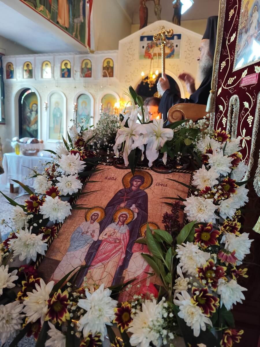 Στην ιερά αυτή πανήγυρη χοροστάτησε ο Σεβασμιώτατος Μητροπολίτης μας κ. Τιμόθεος, συμπροσευχόμενος με τους πιστούς της περιοχής, οι οποίοι προσήλθαν με ευλάβεια για να τιμήσουν την Αγία Μητέρα και τις τρεις Αγίες θυγατέρες της.