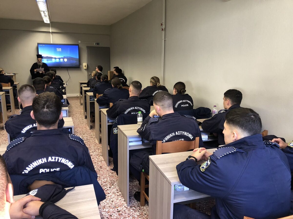 Εκεί είχε την ευκαιρία να απευθύνει διδαχή στους και στις δοκίμους αστυφύλακες, προσφέροντας πνευματικό προβληματισμό και καθοδήγηση πάνω στο επίκαιρο και ιδιαίτερα σημαντικό θέμα «Θρησκευτικός Φονταμενταλισμός».