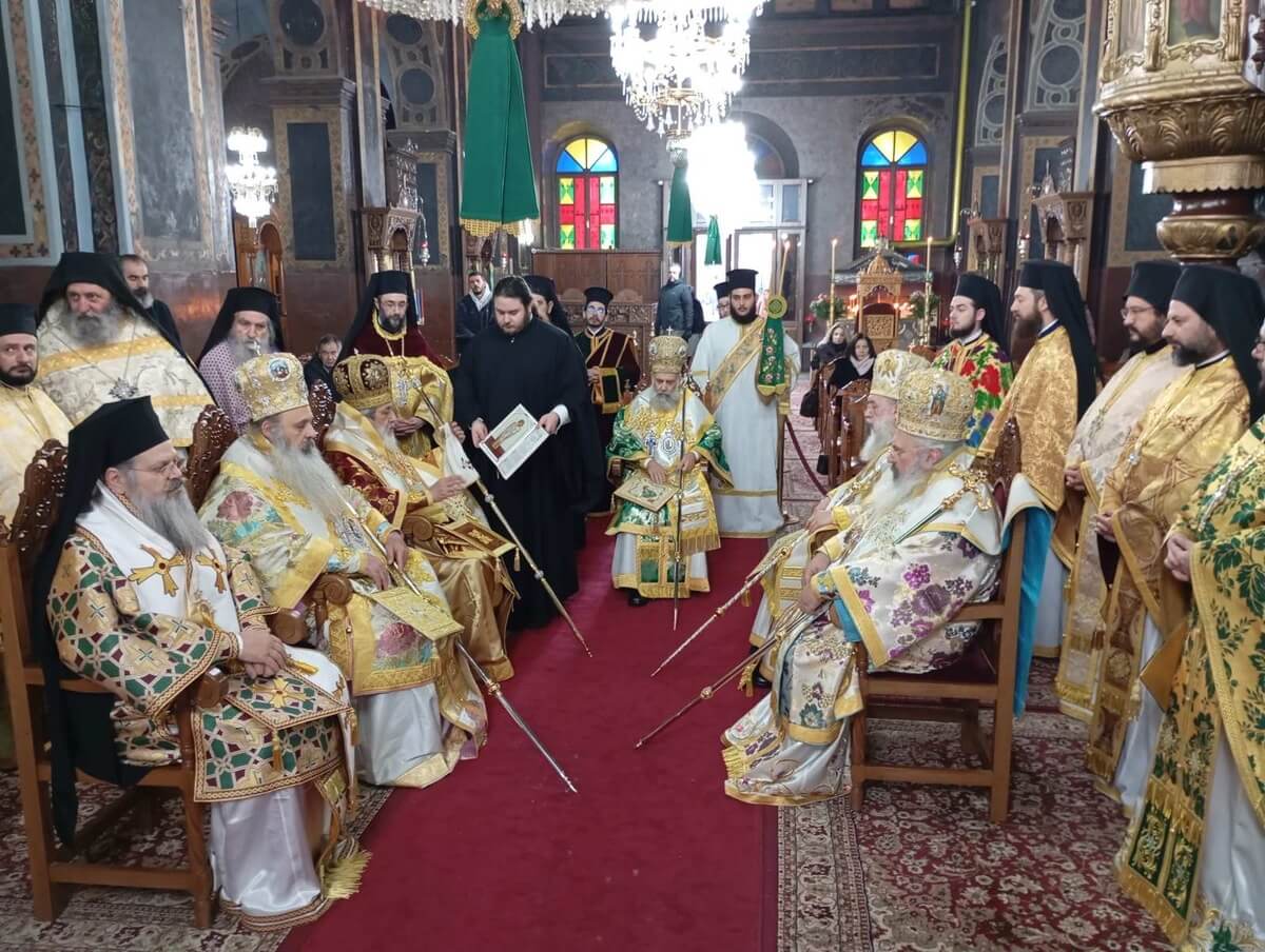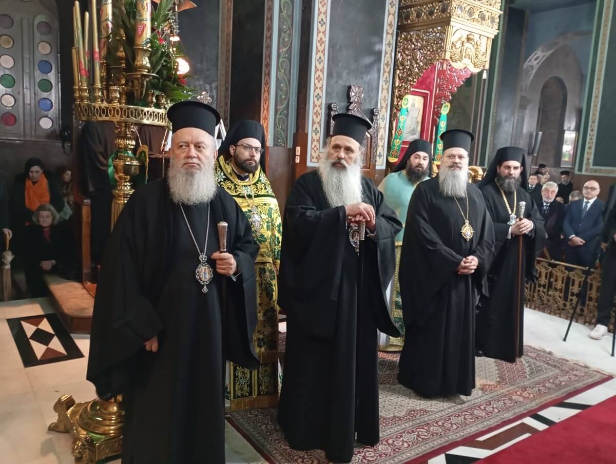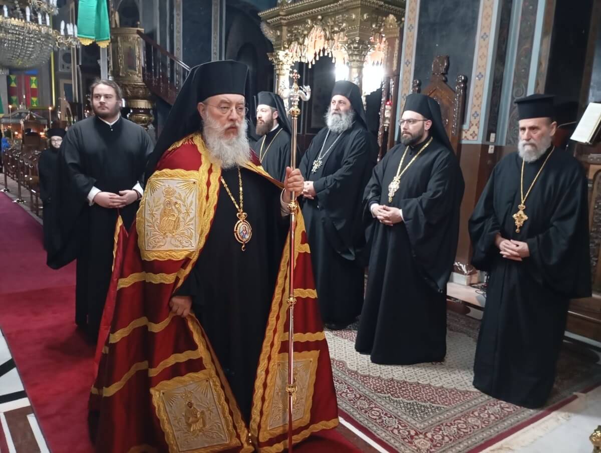 Θέλω να τιμήσουμε και τους Αγίους Αρχιερείς, των οποίων τα σεπτά ονόματα ήδη ανεφέρθησαν, και να τους ευχαριστήσουμε κυρίως γιατί είναι παρόντες και μας ευλόγησαν σήμερα και χθες, τον Επίσκοπο, τον Ιερό Κλήρο και τον ευλογημένο λαό, αλλά και όλους εσάς, που χθες και σήμερα είμαστε εδώ συναγμένοι στον Ιερό Μητροπολιτικό μας Ναό, για να τιμήσουμε τον Άγιο Απόστολο Τιμόθεο και να προσευχηθούμε για τον Επίσκοπο, γιατί έχει ανάγκη πολλής προσευχής, πνευματικής επιστήριξης και ενδυναμώσεως.