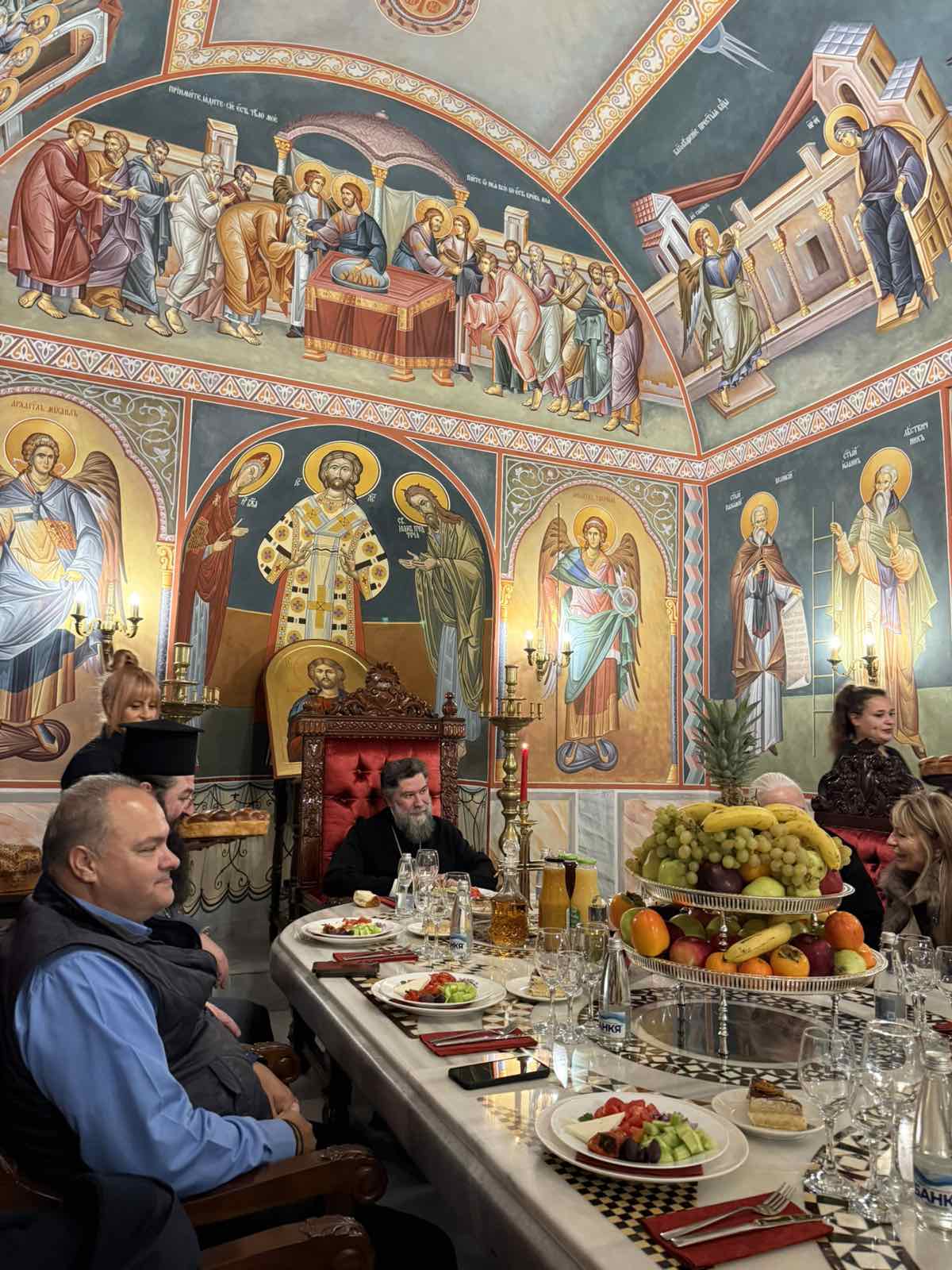 Ακολούθως, παρετέθη εόρτιο κέρασμα στο αρχονταρίκι της ιεράς Μονής και στην συνέχεια τελέσθηκε η ακολουθία του Αγιασμού των εγκαινίων εκθέσεως θρησκευτικών εικόνων και πινάκων ζωγραφικής. Έπειτα, κατά το έθος, ευλογήθηκε η πατροπαράδοτη μοναστηριακή τράπεζα.