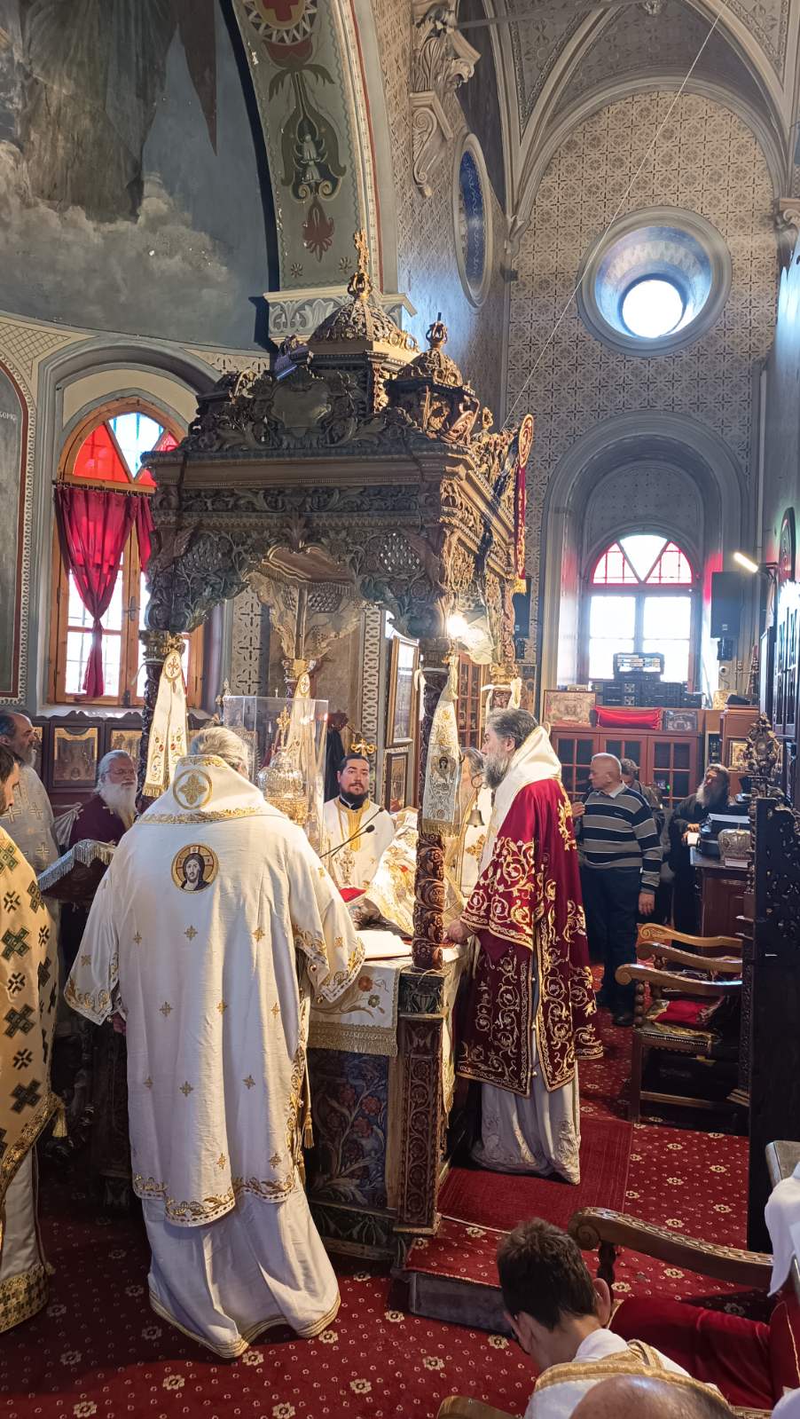 Συγκεκριμένως, το Σάββατο 25 Απριλίου, τελέσθηκε ο μέγας πανηγυρικός, πολυαρχιερατικός Εσπερινός, χοροστατήσαντος του Σεβ. Μητροπολίτου Λαρίσης και Τυρνάβου κ. Ιερωνύμου, συγχοροστατησάντων των Σεβ. Μητροπολιτών Μυτιλήνης, Ερεσσού και Πλωμαρίου κ. Ιακώβου, Σερρών και Νιγρίτης κ. Θεολόγου και του πολυσεβάστου οικείου Ποιμενάρχου Μηθύμνης κ. Χρυσοστόμου.