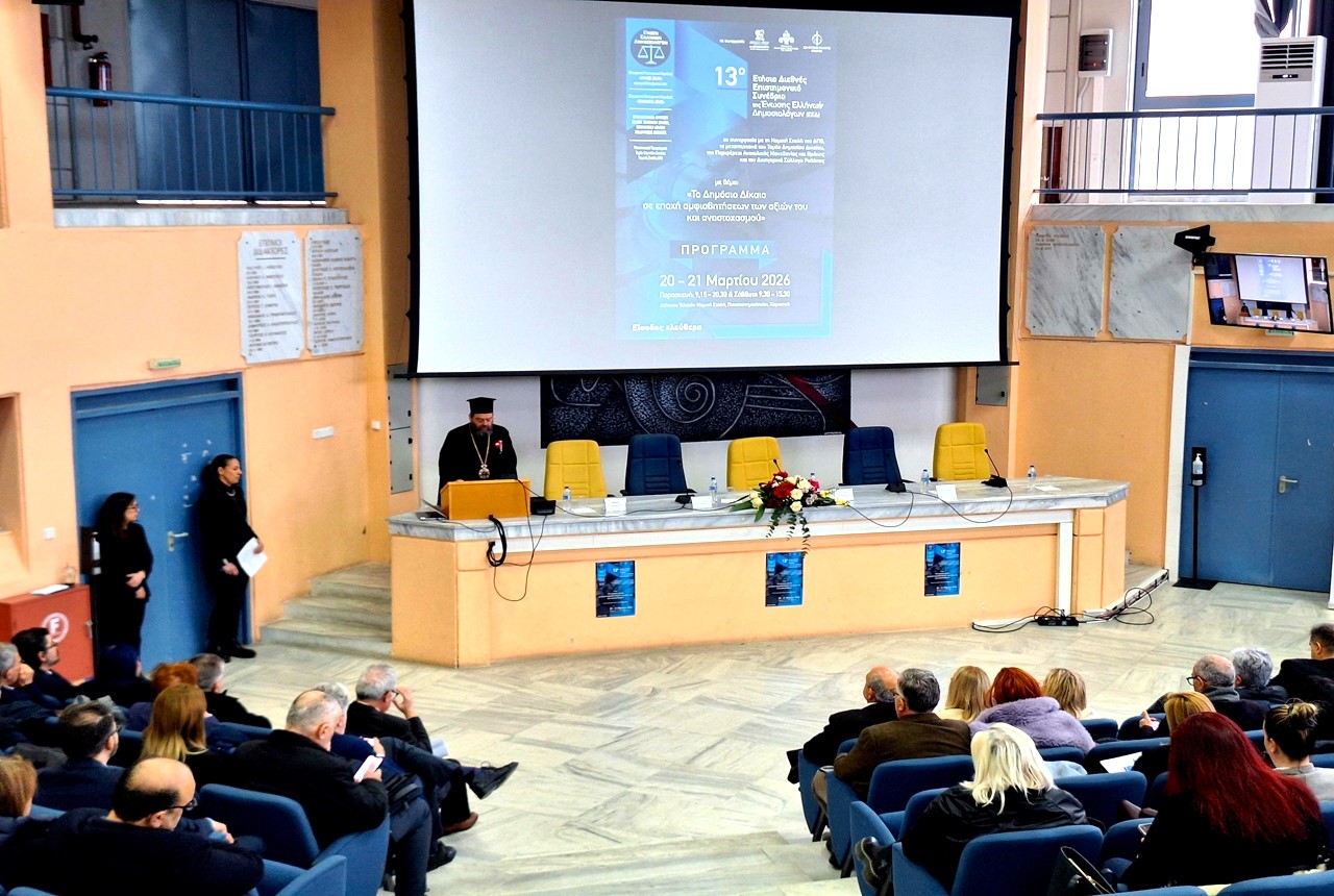 Σήμερα Παρασκευὴ 20 Μαρτίου 2026, ὁ Σεβασμιώτατος Μητροπολίτης μας, εὐγενῶς προσκληθείς παρέστη στὴν ἔναρξη τοῦ 13ου Διεθνοῦς Ἐπιστημονικοῦ Συνεδρίου τῆς Ἑνώσεως Ἑλλήνων Δημοσιολόγων (ΕΕΔ), μὲ θέμα: «Τὸ Δημόσιο Δίκαιο σὲ ἐποχὴ ἀμφισβητήσεων τῶν ἀξιῶν του καὶ ἀναστοχασμοῦ », τὸ ὁποῖο πραγματοποιεῖται στὸ Ἀμφιθέατρο τῆς Νομικῆς Σχολῆς τοῦ Δημοκριτείου Πανεπιστημίου Θράκης καὶ ἀπηύθυνε σχετικό χαιρετισμὸ, εὐχόμενος πλήρη ἐπιτυχία στὶς ἐργασίες τοῦ Συνεδρίου καὶ πλούσια τὴν εὐλογία τοῦ Θεοῦ σὲ ὅλους.